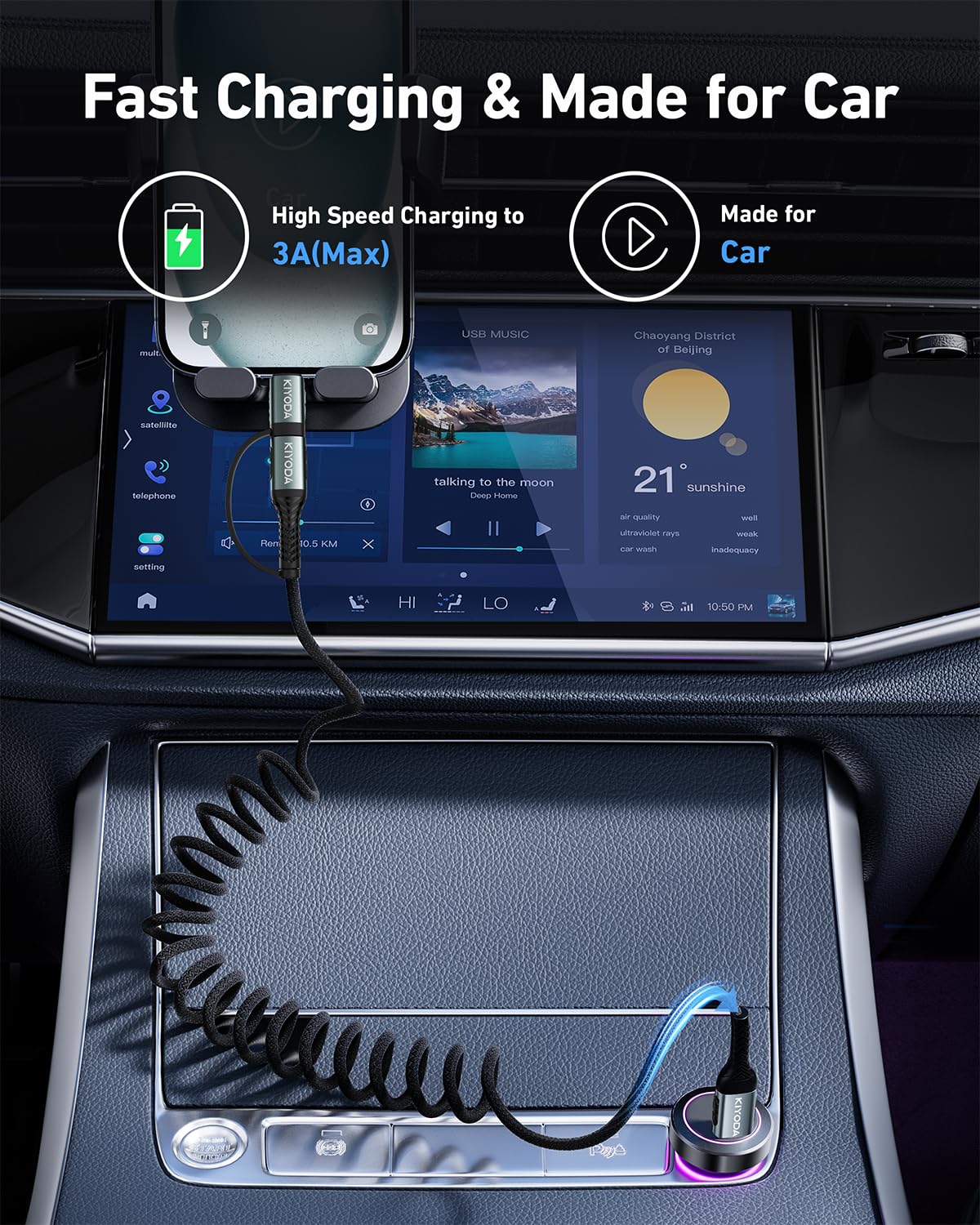 - USB C and Lightning Cable 2 in 1 : The Coiled 2-in-1 Charging Cable is compatible with both your iPhone and Android phones for simple phone charging. Two charge modes - USB C to Lightning, and USB C to USB C - in one cable. The 3 foot Multi Charging Cable not only charges in multiple modes, but also fully supports Apple CarPlay, and the iPhone Car Play Cable connection is stable.