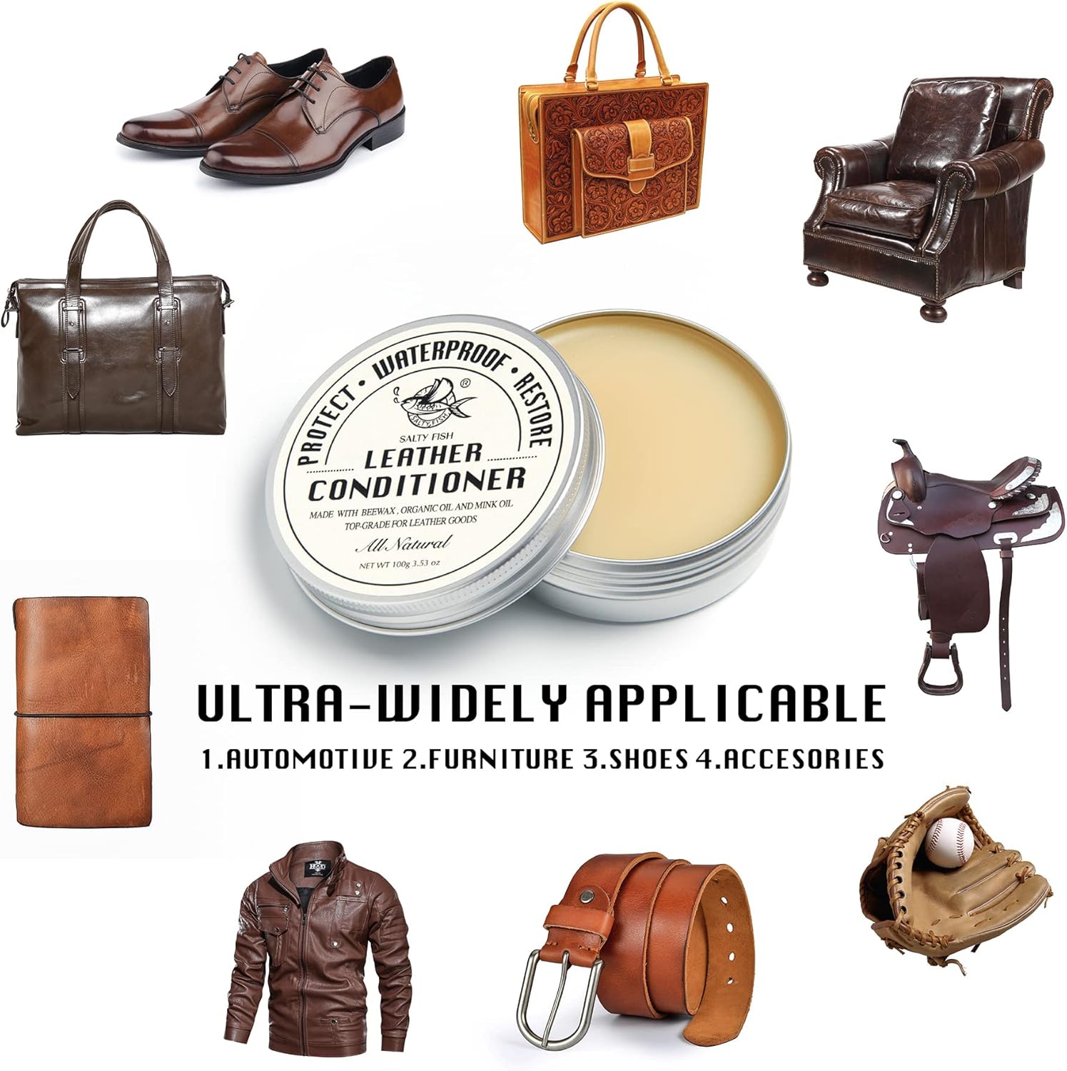 - ALL-NATURAL LEATHER CONDITIONER: SALTY FISH believes in the power of nature,this leather conditioner is made with a unique blend of food-grade all-natural ingredients, mink oil, beeswax, and plant oils in a unique ratio. Specially developed for leather products, it emits natural fragrance, non-toxic and long-lasting maintenance, non-greasy and residue-free