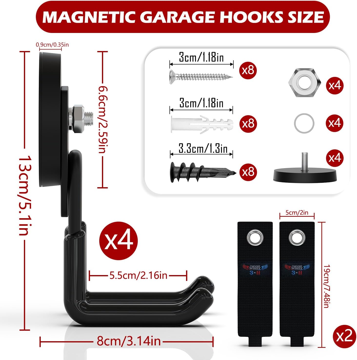 - Multi-functional Hook Magnets Heavy Duty: Your package includes 4 large U magnetic storage hooks, 2 extension cord organizer, and a comprehensive set of accessories comprising steel nails, flat washers, spring washers, and screws. For added convenience, the magnetic tool holder is accompanied by storage straps made of high-density nylon blend material with Velcro fastening, allowing for easy length adjustment and the hanging of various tools