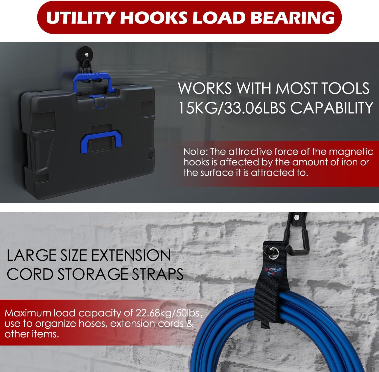 - Innovative No-Drill Magnetic Hooks: Eliminate the need to punch holes and effortlessly adhere magnet hooks to any metal surface, you can move them around as your needs change. The large magnetic hook has a dual-hook design for versatile use and can be separated into magnet and hook components. Our magnets with garage hooks heavy duty are coated with non-slip PVC and has protective sleeves to prevent scratches and rust
