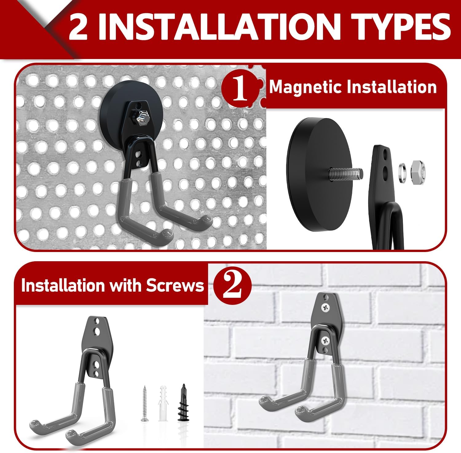 - Easy To Install Strong Heavy Duty Hooks: 2 usage options available: (1) heavy duty magnetic hooks for garage can be adsorbed on any metal surface. No tools, drilling, or screws are required for installation, ensuring no damage to the surface. (2) Alternatively, you can remove the magnet and use the garage storage hooks independently. For storing heavier tools, we provide sturdy screws that can be used to securely install the heavy duty hooks for garage on any wall surface