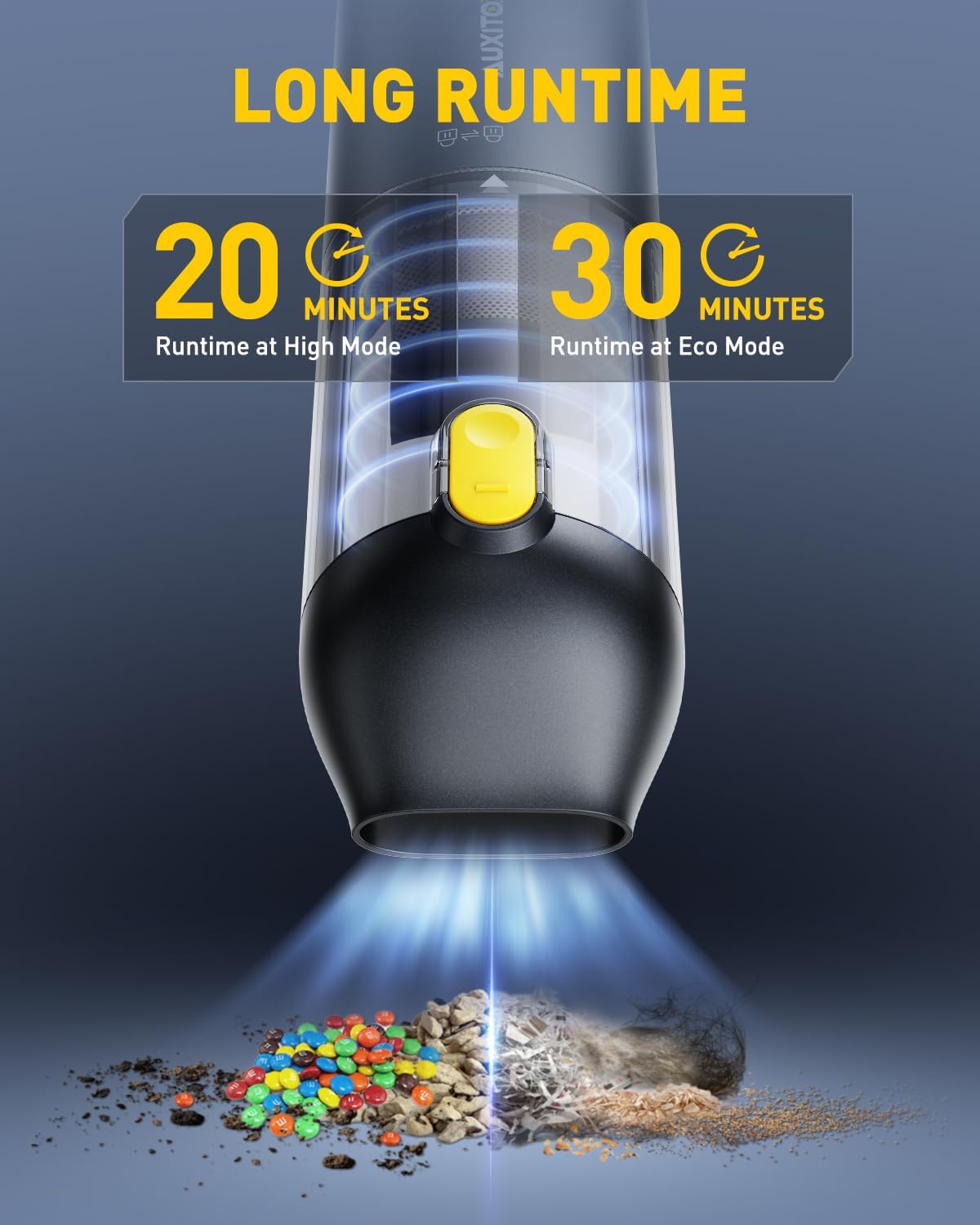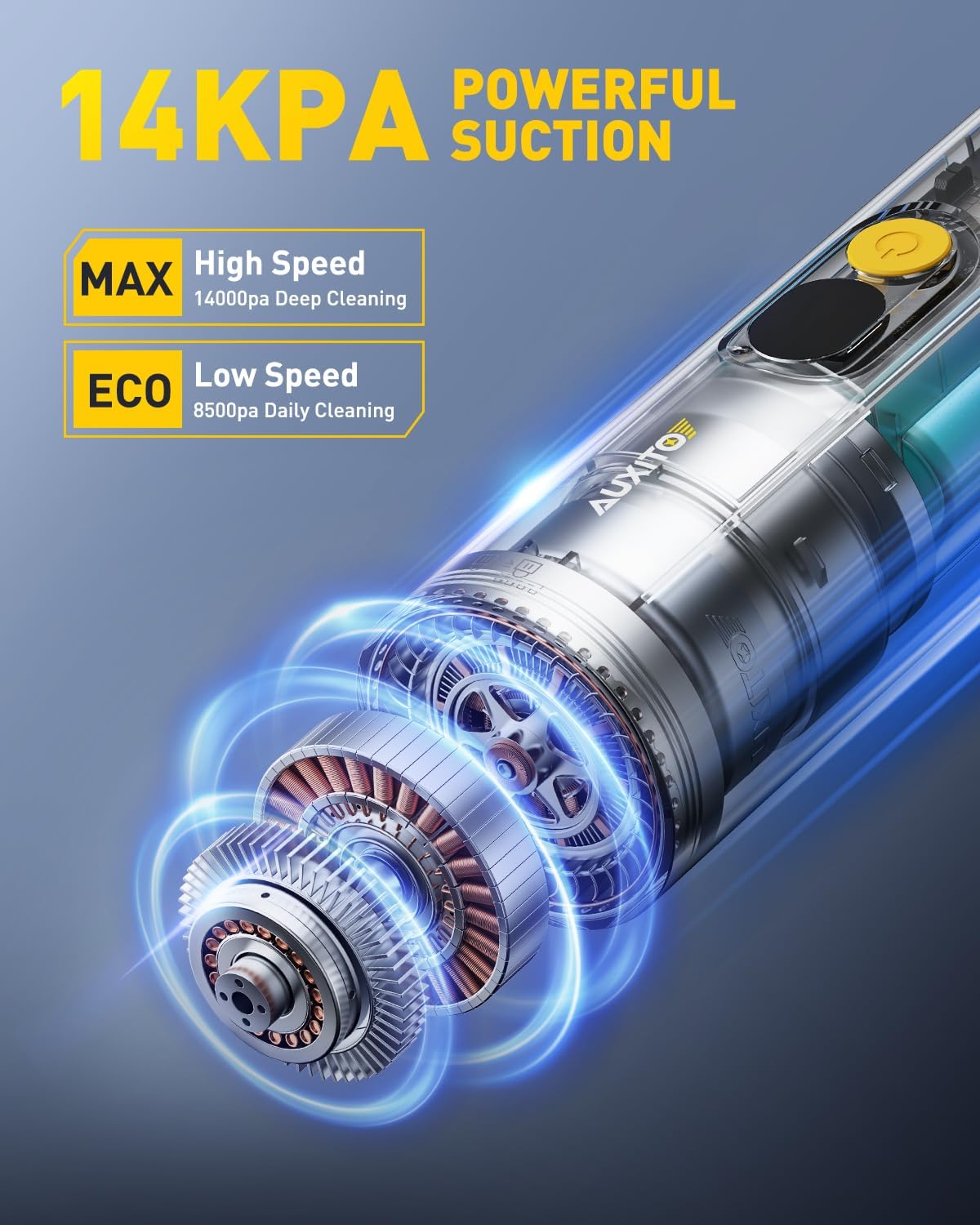- 【14000PA HIGH POWER SUCTION HANDHELD VACUUM】The upgraded high-speed brushless motor delivers 14000Pa of powerful suction to quickly and easily pick up stubborn sand, dust, and debris. 2 suction modes of 8500PA and 14000PA are available to meet your different cleaning needs. (If the vacuum cleaner is in a low battery state, you may feel weakened suction power when using the high speed mode, and you need to charge it in time when using the high speed mode continuously.)