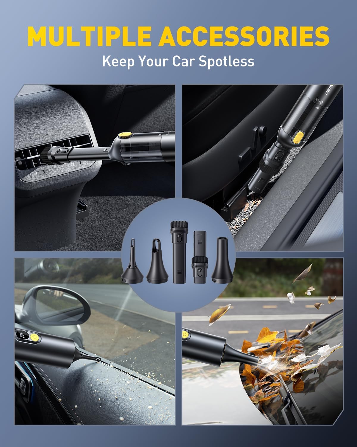 - 【4 IN 1 MULTI-FUNCTIONAL CORDLESS CAR VACUUM】AUXITO Mini Vacuum Car Cleaner is equipped with a variety of nozzles to perfectly meet the different needs of vacuuming, blowing, inflating and pumping. It not only quickly cleans car seats, trunks, floor mats, computer keyboards, sofas, carpets and any hard-to-reach places, but also helps to inflate yoga balls, swimming rings and all inflatable items, and vacuums air for all kinds of vacuum storage bags to save space