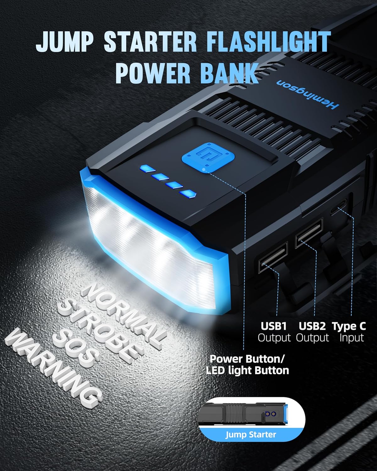 - Lightweight & User-Friendly Design: This battery jumper features clear indicators. The ultra-compact battery jumper starter portable (7.2”x1.5”x3.4”, 0.85 lbs) slips into tight spaces. Its compact size fits seamlessly in gloveboxes, backpacks, or emergency kits. HEMINGSON empowers confident adventures for families, solo travelers, and outdoor enthusiasts