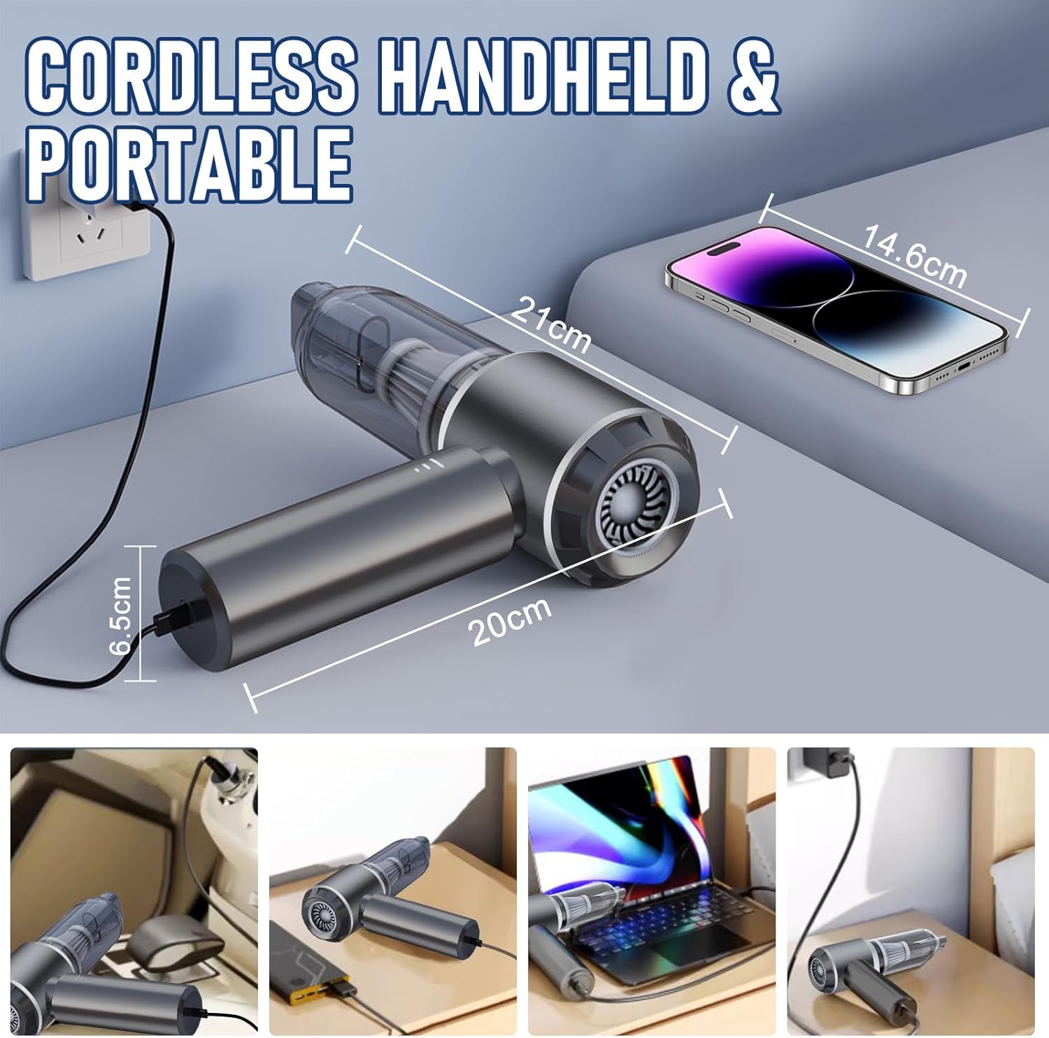 Car Vacuum Portable Cordless 20000PA High power Mini Vacuum Cleaner 4-in-1 Compressed Air Duster & Air Blower & Pump Hand Held Vacuum with Brushless Motor for Car, Home, Office,Camping (Silver)