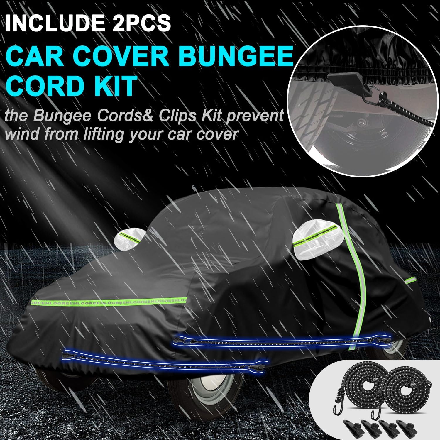 - Windproof Design - With the ① 2pcs heavy-duty car cover straps, your Mini Cooper car cover will be held tightly and fixed securely by the powerful grip of the clips. Attached to the elastic bungee cords, the clips fit perfectly along the front and rear of your vehicle. There are also ② 4 pairs of wheel straps, a ③ car bottom strap with buckles, and ④ 2 extra long windproof strips to strengthen the fixing of the car cover against typhoon weather.