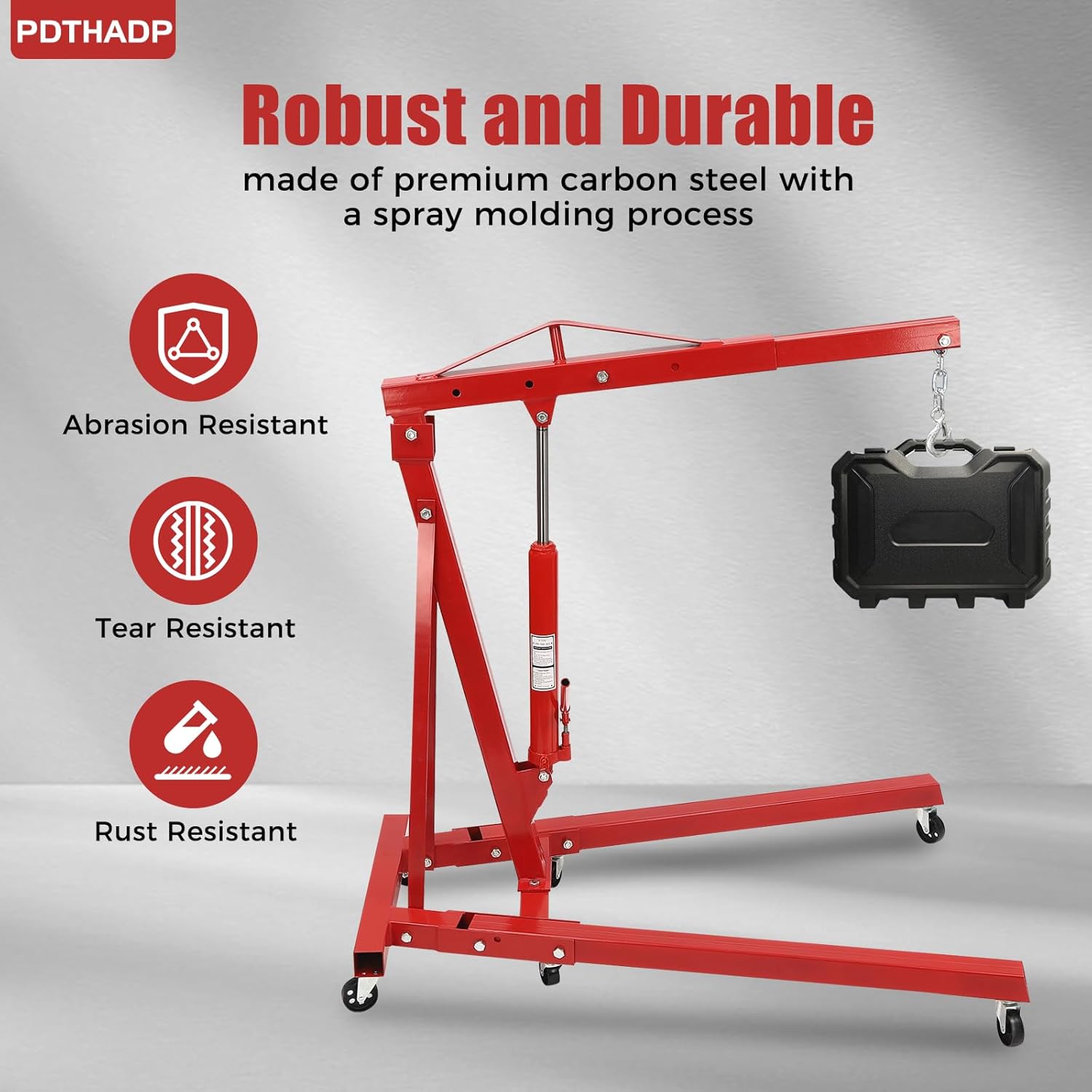 - đź’ŻBUILD TO LAST:Thick carbon steel and Argon arc welding and spraying plastic processes make this folding engine hoist hard and resistant to rust, and wear, so you can use it indoors and outdoors with confidence.