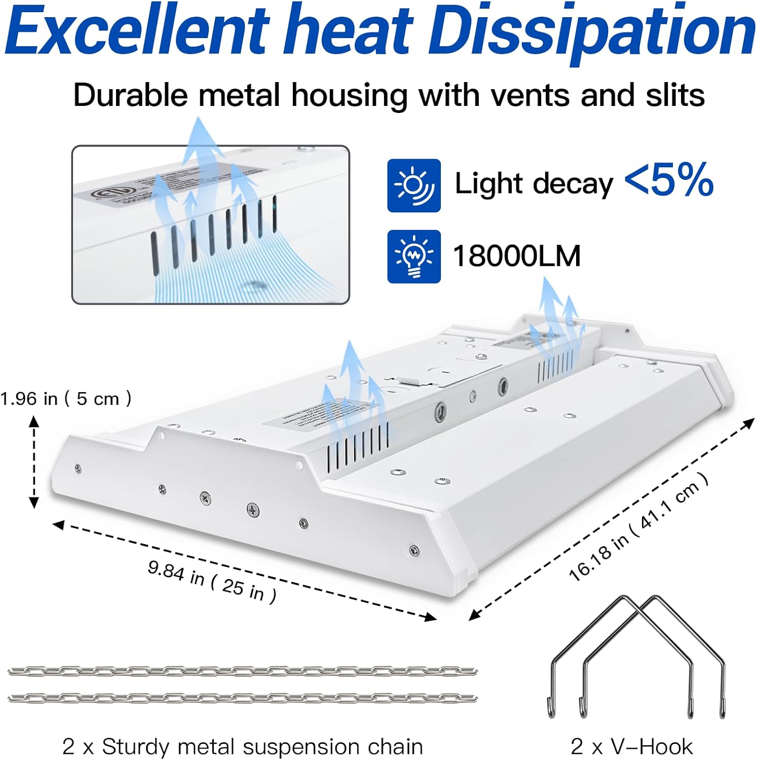 - 【Superb Heat Radiation】The linear highbay workshop light has a great heat dissipation design. Its anti-rust aviation aluminum housing has multiple heat dissipation holes. This design gives it remarkable heat dissipation capabilities, ensuring a 50,000-hour lifespan (8 hours daily use equals 17 years).