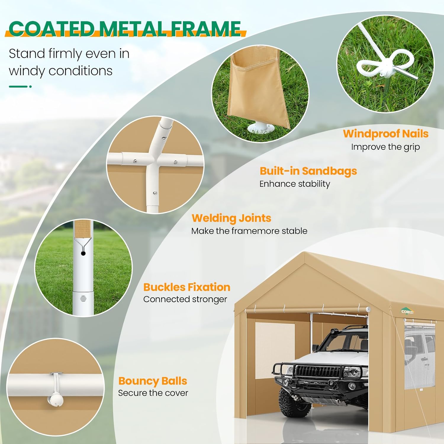 COBIZI Carport Canopy 12x20 Heavy Duty Portable Garage with Roll-Up Ventilation Windows & Doors, Removable Sidewalls Car Canopy Tent Waterproof with Built-in Sandbags for Cars, Boats, Trucks, Khaki
