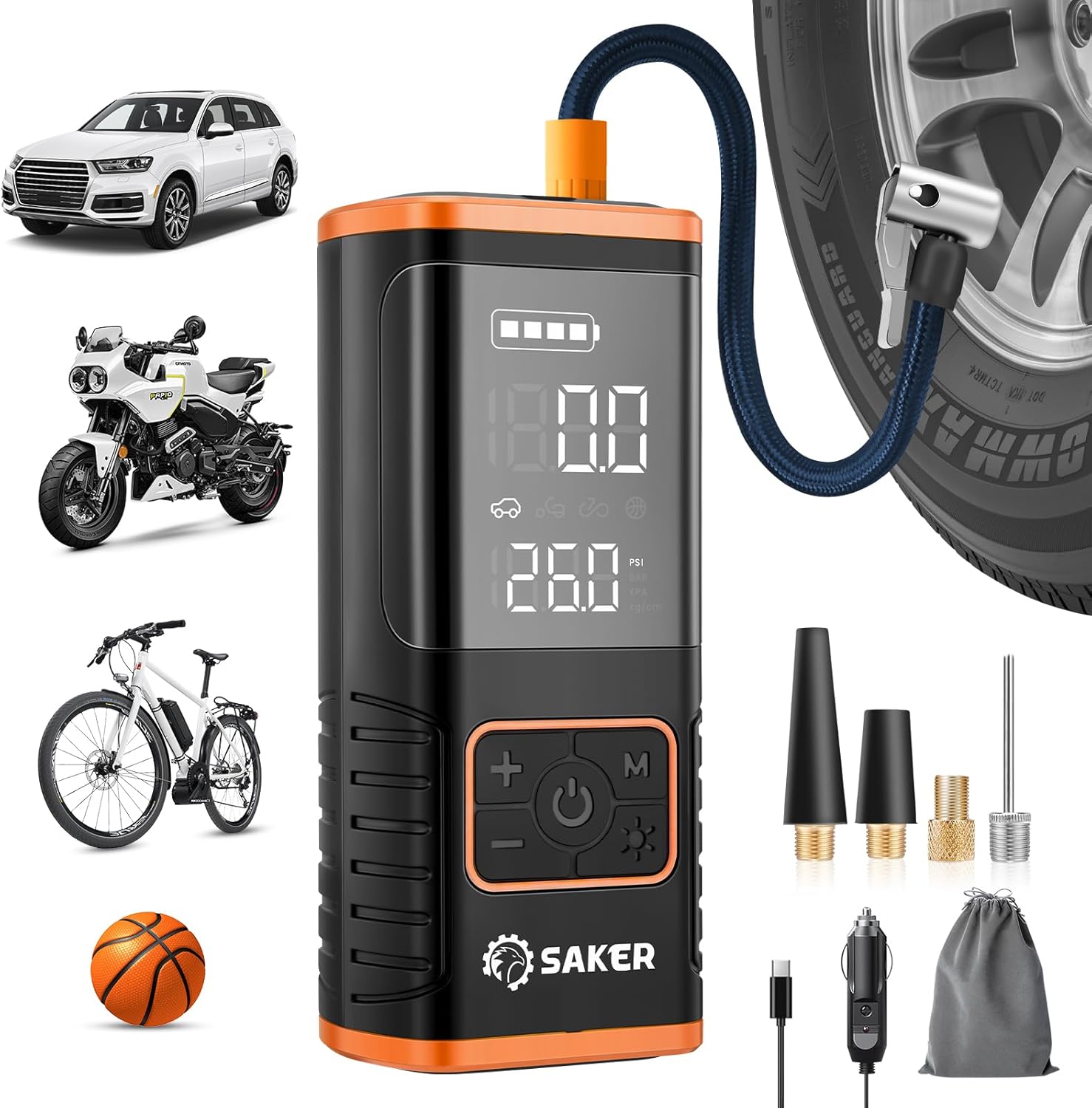 Saker Tire Inflator Portable Air Compressor - 150PSI Car Tires Air Pump with Tire Pressure Gauge Led Light, 7500mAh Battery & 12V DC Smart Tire Inflator for Car, Motorcycle, Bike Tire, Ball