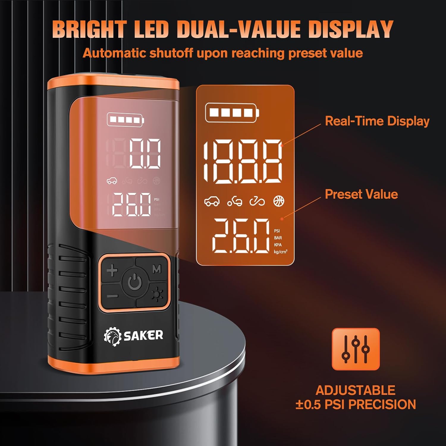 - 【ACCURATE LED DISPLAY AND AUTO STOP FUNCTION】Saker air pump is equipped with a high-precision chip, enhancing pressure detection accuracy. The LED screens provide real-time pressure and battery levels for easy observation and operation. The auto-stop function ensures the inflator stops when the preset pressure is reached, preventing over-inflation and ensuring safety.