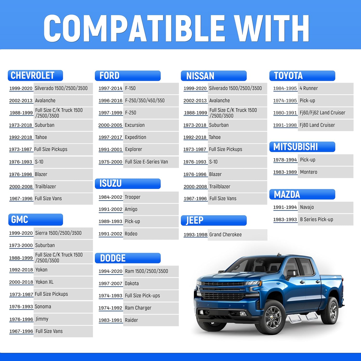 - Vehicle Fitment: Compatible with 1967-2020 Chevrolet Silverado Avalanche C/K Suburban Tahoe S-10 Blazer Trailblazer; Compatible with 1967-2020 GMC Sierra C/K Suburban Yokon XL Sonoma Jimmy; Compatible with 1975-2016 Ford F150 F250 F350 F450 F550 Excursion Expedition Explorer; Compatible with 1984-2002 Isuzu Trooper Amigo Rodeo.