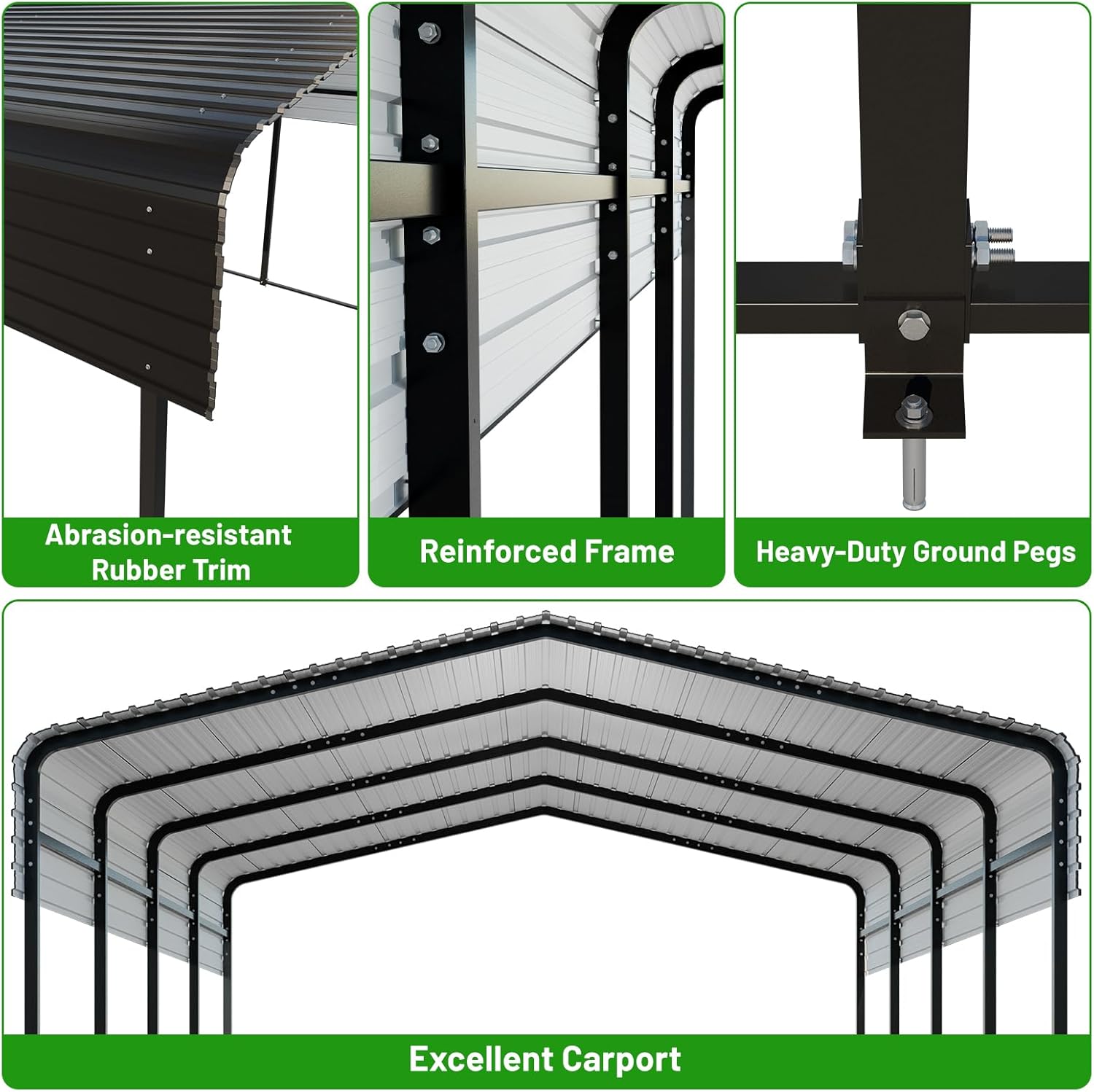 - Strong Frame Construction: The 2-inch diameter, 0.05-inch wall thickness square steel tube frame provides an exceptionally strong and stable foundation for our carport canopy. The addition of soft and abrasion-resistant rubber trim around the edge of the roof further enhances overall safety and protection from potential scratches or injuries.