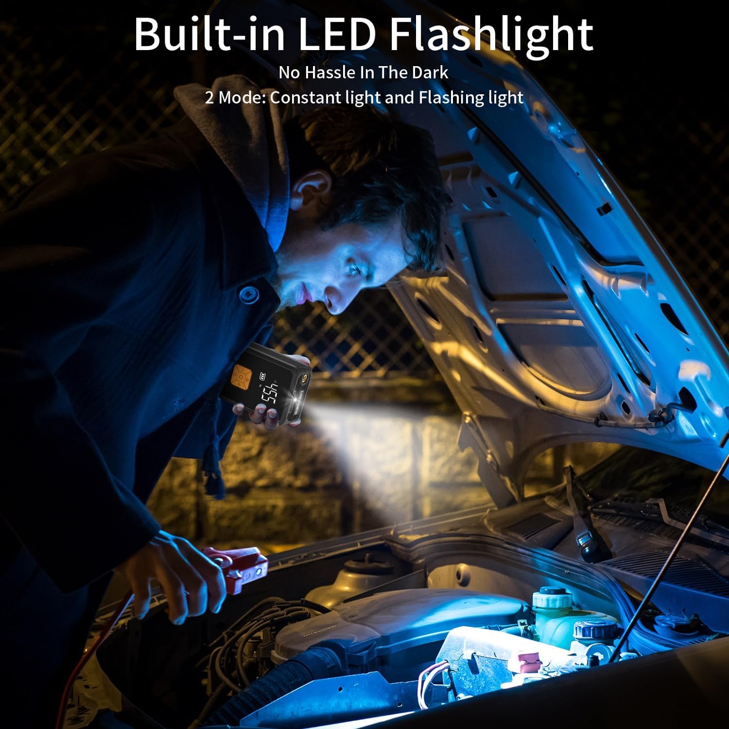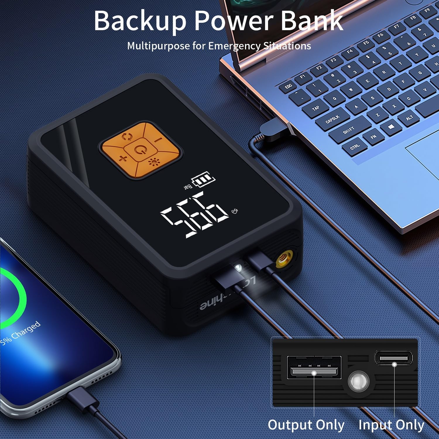 - 【Emergency Tire Pump】Not just a tire inflator portable air compressor for car tires, also a multifunctional emergency tool. This battery powered tire inflator has an LED light at the top for inflating in the dark, changing tires, or repairing vehicles at night. The top also includes a USB-C input port and a USB-A output port, which can be used as an emergency power source to charge electronic device.
