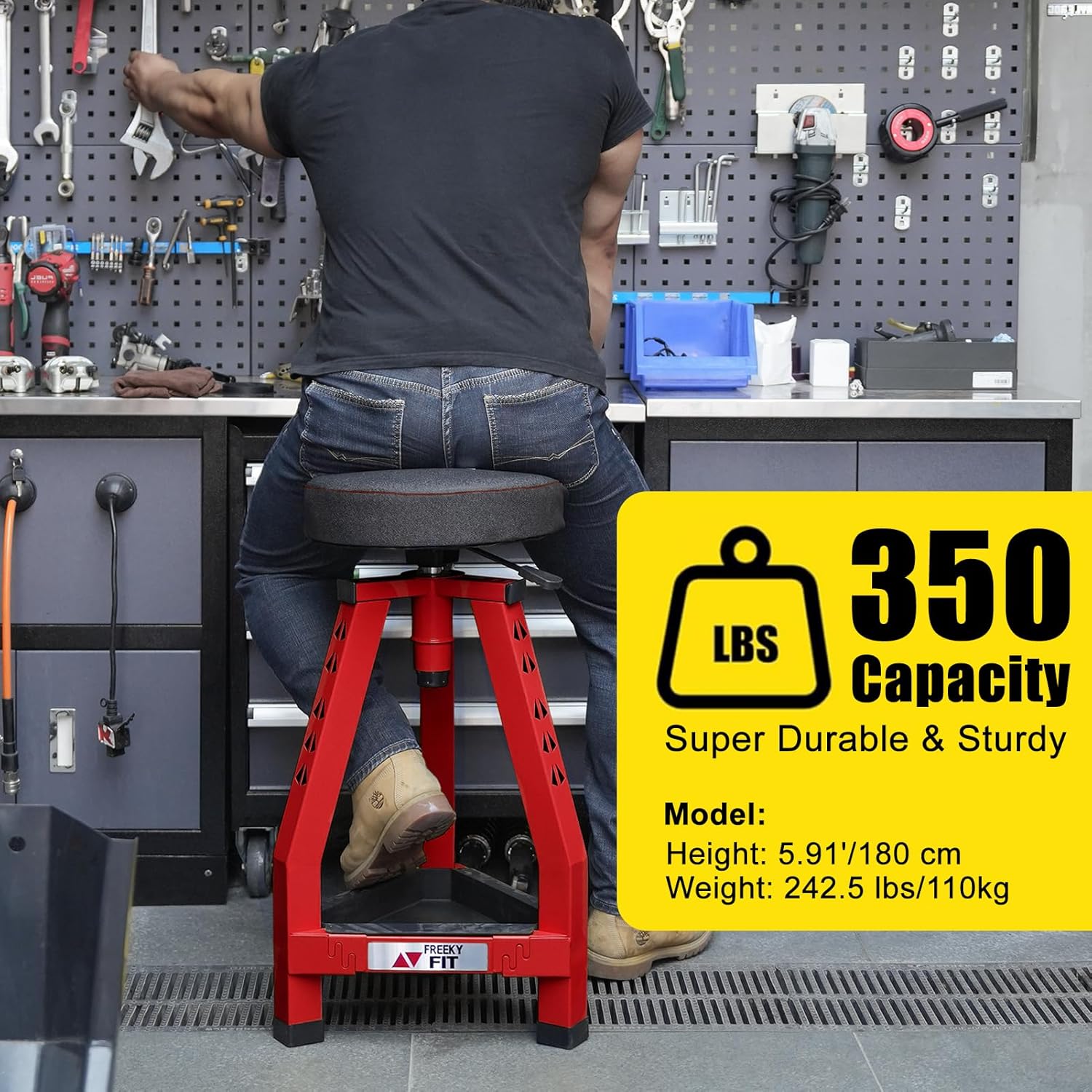 - 【350 LBS & 360°】The flexible 360° rotating seat provides greater range of motion and movement. The heavy duty mechanic stool is specially designed with a thick angle steel frame for long-lasting performance and reliability and footrest. Its design can withstand heavy use, with an overall weight capacity of around 350 pounds. It is a sturdy and practical choice for use in garages, workshops, working bar, and other places
