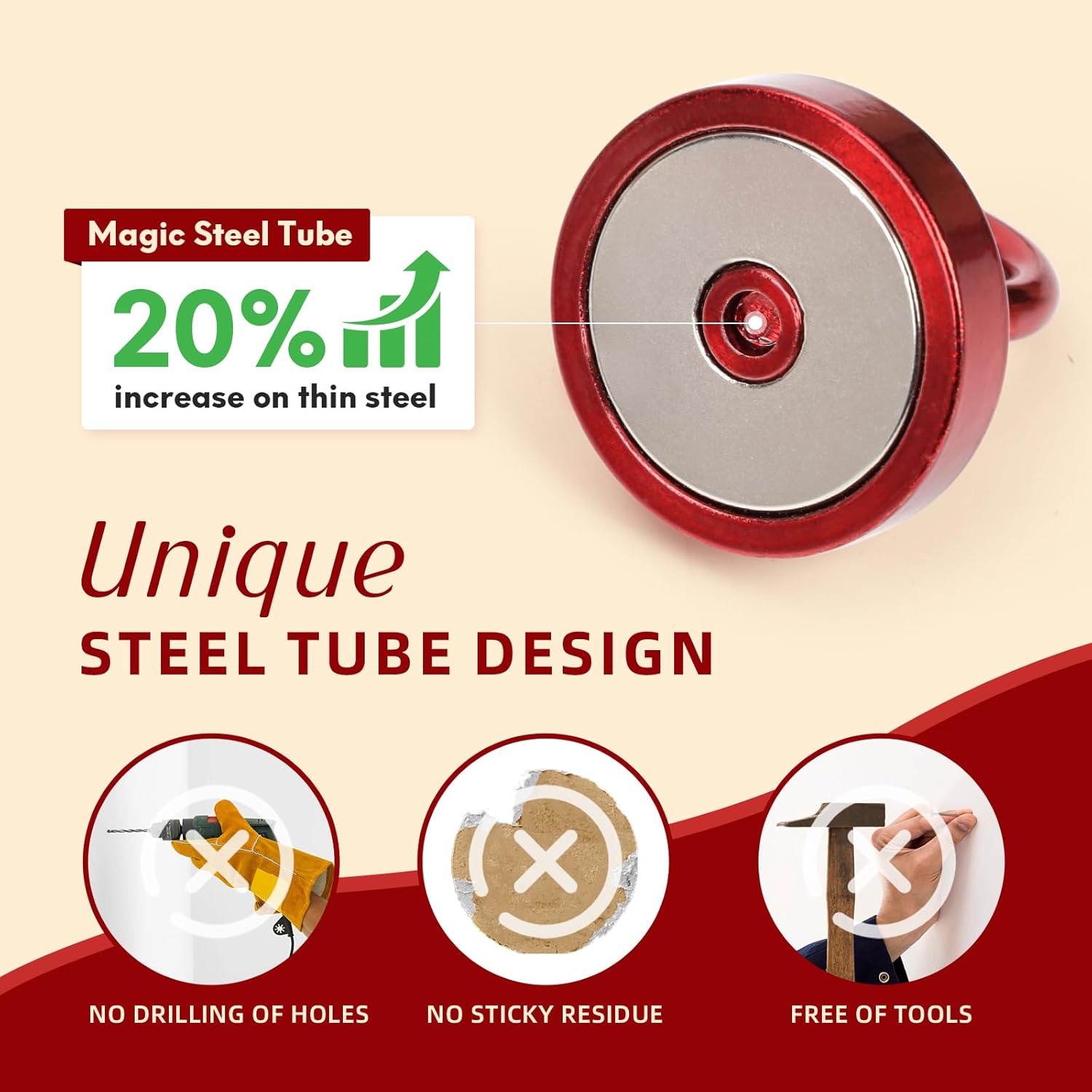 - ✔MAGIC STEEL TUBE DESIGN - Unique design of steel tube inside the base of magnetic hooks greatly increases the attractive force , especially on thin steel! It increase approximately 20% force comparing those none-tube magnets. it solves the problem of weak force on thin steel. Permanent magnetic hook with magic steel tube, strong magnetism lasts forever!