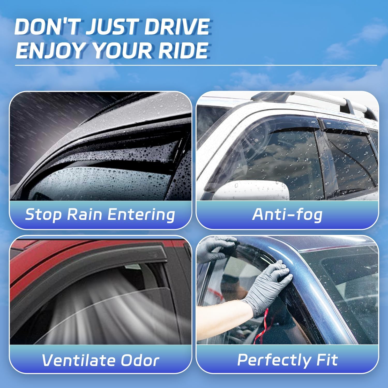 - Fully Functional: Enjoy the outside fresh air with a slightly open window in any weather. Reduce interior wind noise and mirror fogging; reduce sun glare through side windows; reduce the need for the use of air conditioning