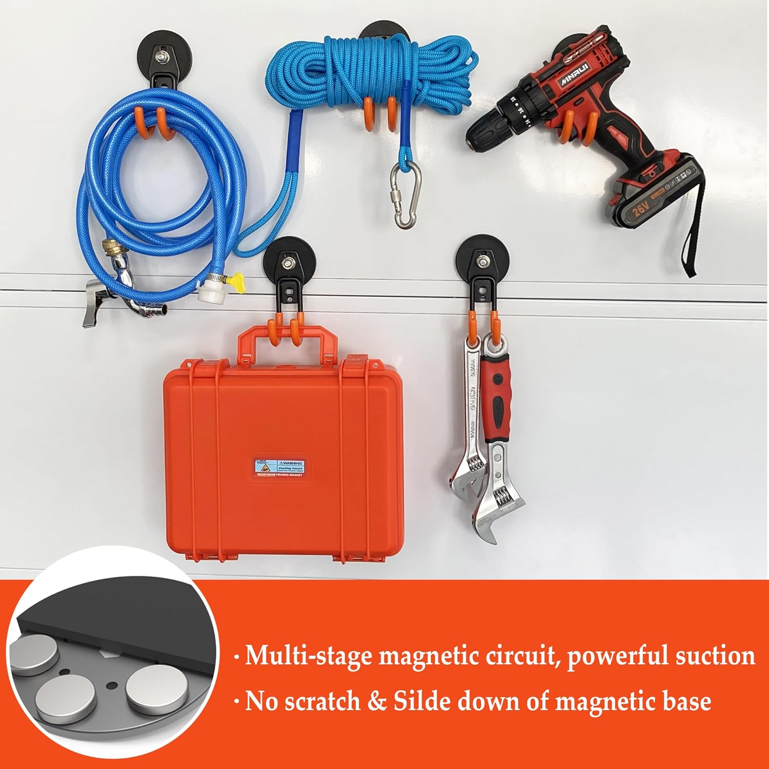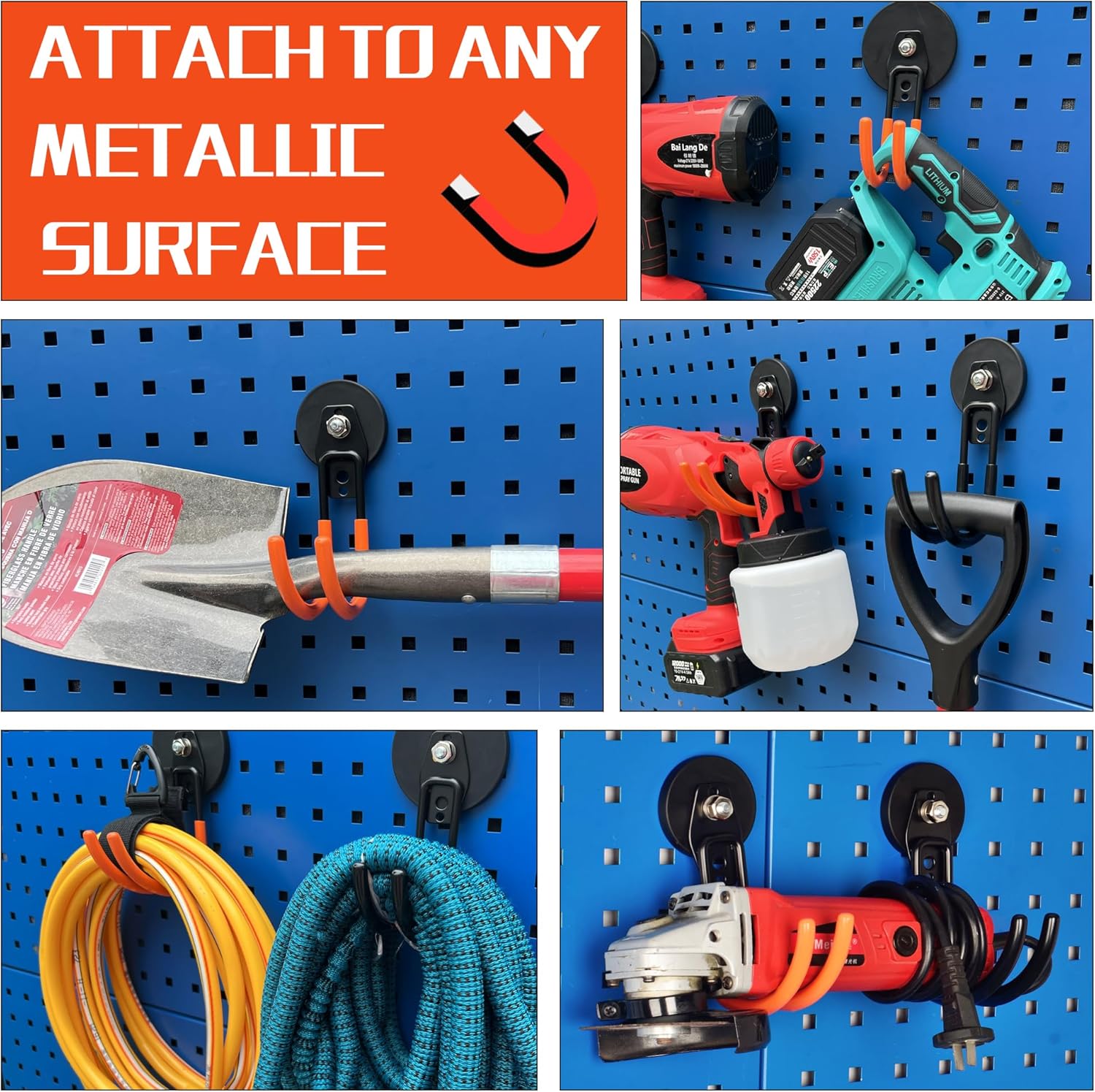 - [Heavy Duty Magnetic Hook]: Garage storage hook has two holes, which can easily support the weight and can hang most items. Applicable to scenes such as kitchens, garages, warehouses, offices, etc.Can accommodate various tools and equipment, such as hoses, skates, gym bags, shovel, rake, broom, mop and other garden tools