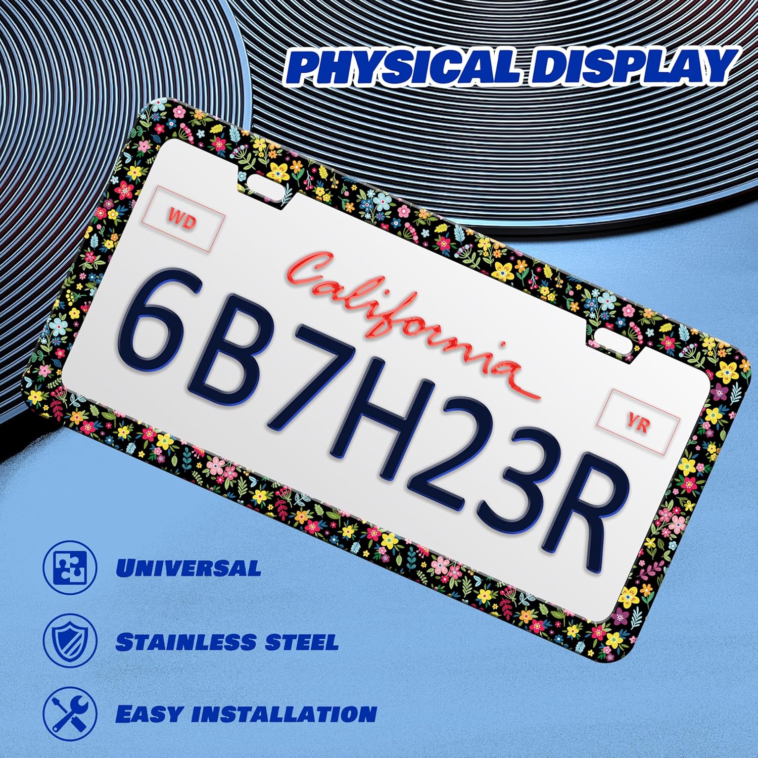 Colorful Folk Floral License Plate Frame Flower License Plate Holder Personalise Stainless Steel Funny Design Compatible with Standard License Plate Frames for USA and Canada 6 X 12 Inch with Screws