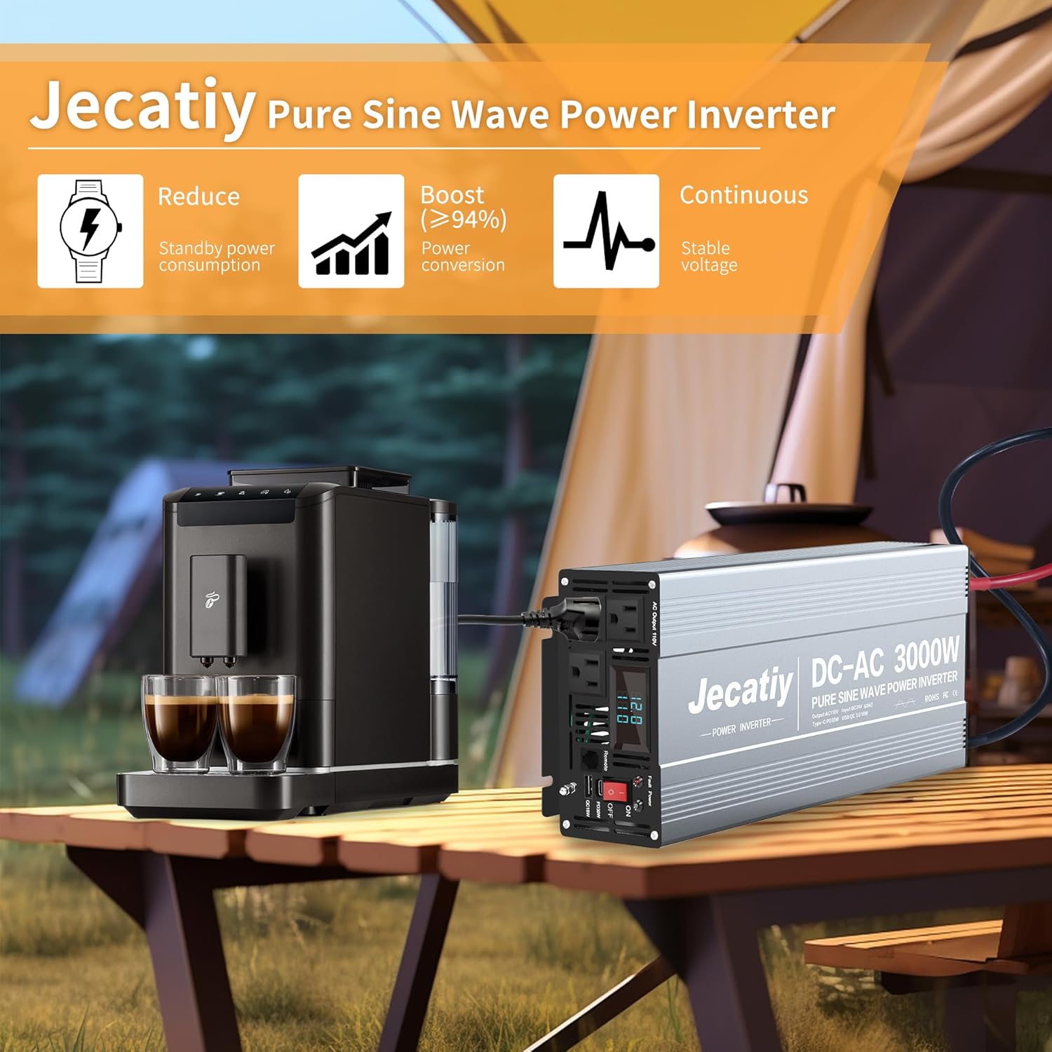 - 【3000W Pure Sine Wave Inverter】Jecatiy upgrade fully 3000W Power Inverter provides a continuous PURE SINE WAVE power of 3000W, with a peak surge of 6000W during load start-up. Tip: It can handle most appliances for you (including refrigerators, microwaves, or some power tools), as well as low-power devices. Note: The voltage of 110V is the actual display, and 100-120V is the supported range of the application.