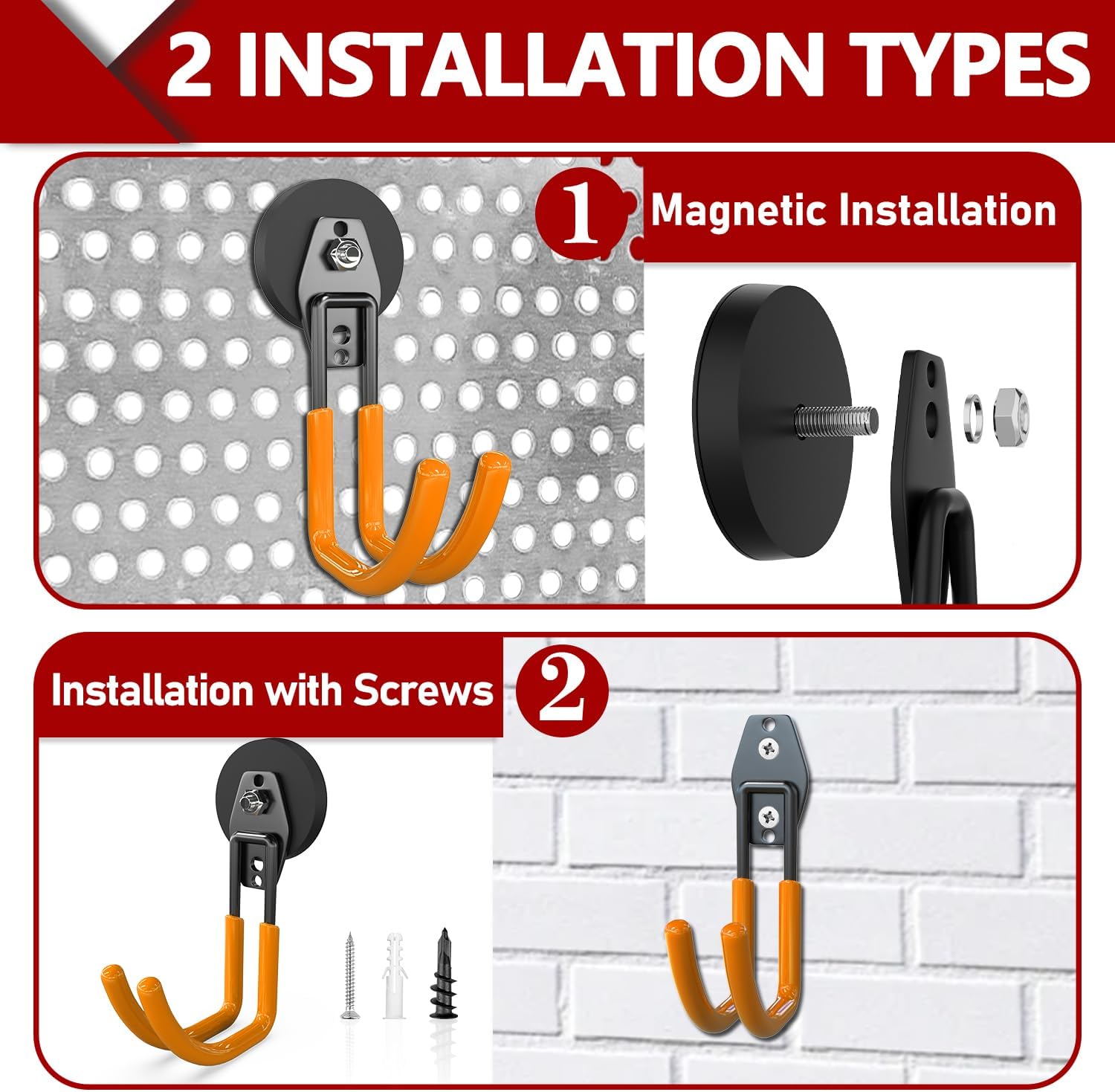 - Easy To Install Strong Heavy Duty Hooks: 2 usage options available: (1) heavy duty magnetic hooks for garage can be adsorbed on any metal surface. No tools, drilling, or screws are required for installation, ensuring no damage to the surface. (2) Alternatively, you can remove the magnet and use the garage storage hooks independently. For storing heavier tools, we provide sturdy screws that can be used to securely install the heavy duty hooks for garage on any wall surface