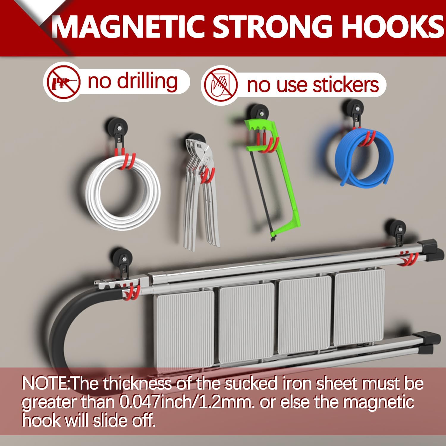 - Innovative No-Drill Magnetic Hooks: Eliminate the need to punch holes and effortlessly adhere magnet hooks to any metal surface, you can move them around as your needs change. The large magnetic hook has a dual-hook design for versatile use and can be separated into magnet and hook components. Our magnets with garage hooks heavy duty are coated with non-slip PVC and has protective sleeves to prevent scratches and rust