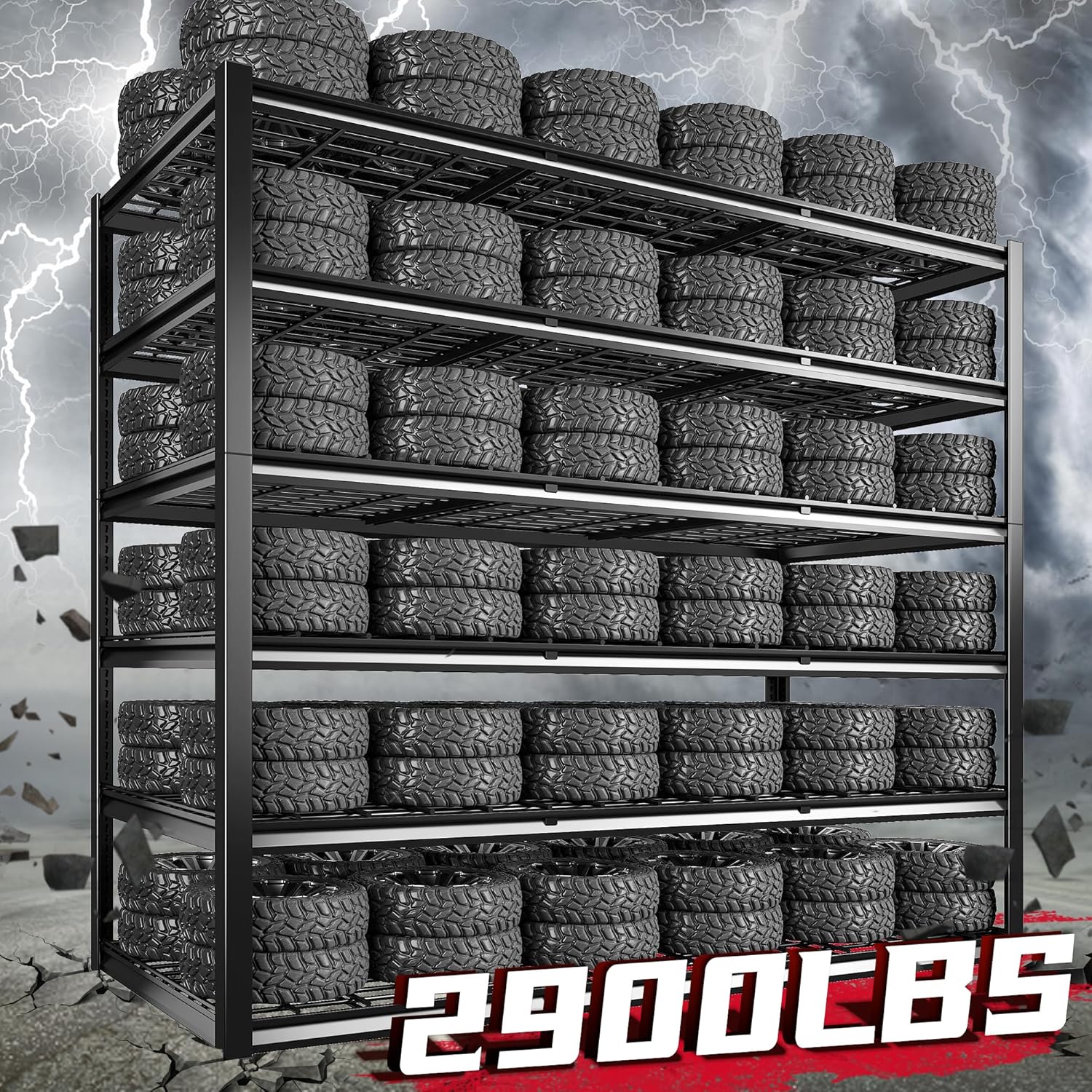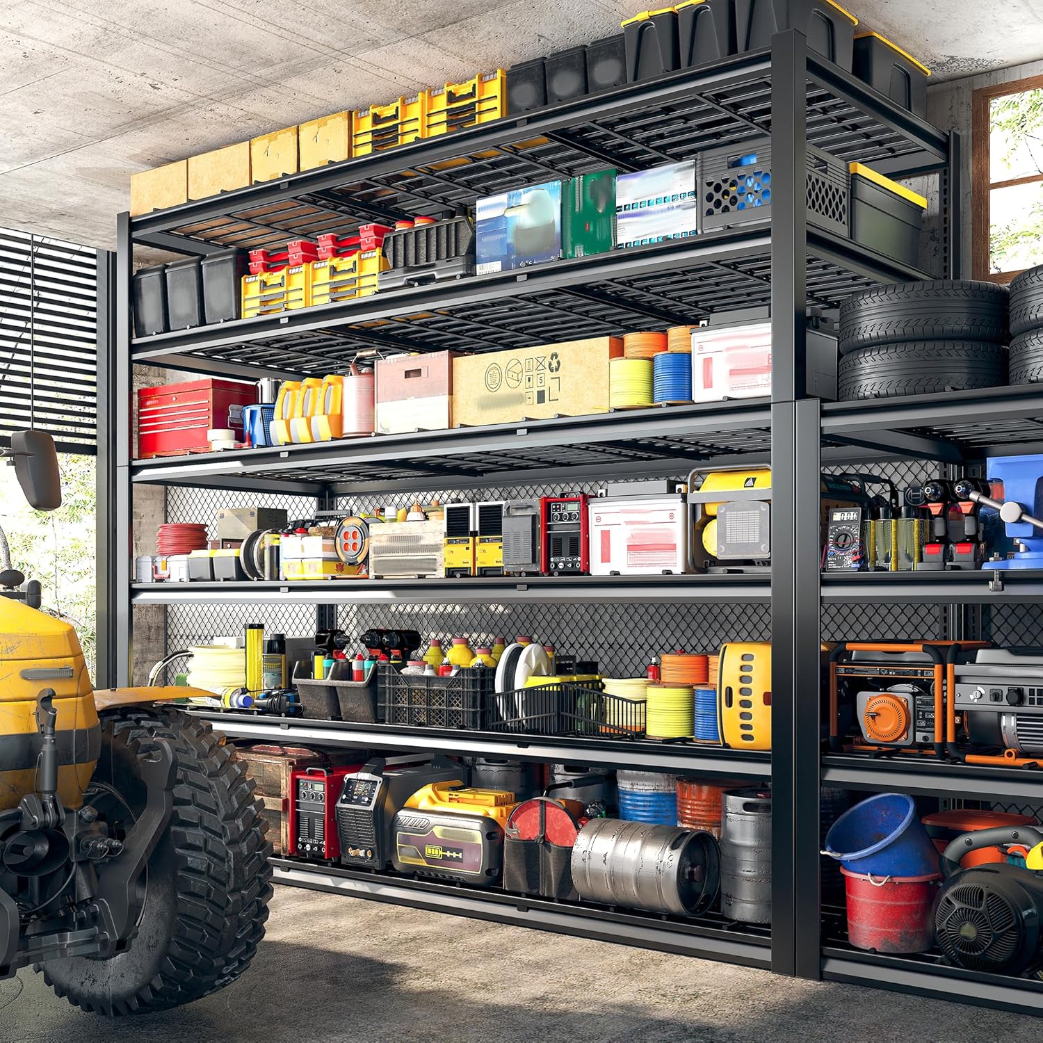 - 【2900LBS Heavy Duty Shelving】The combination of thickened metal mesh of wire shelving and double-layer metal shelves of columns gives the all metal shelves for storage an ultra-high load-bearing capacity of 2900LBS, please rest assured to store heavy items on the garage storage shelves such as toolboxes, vehicle parts, files, dumbbells, office supplies, etc
