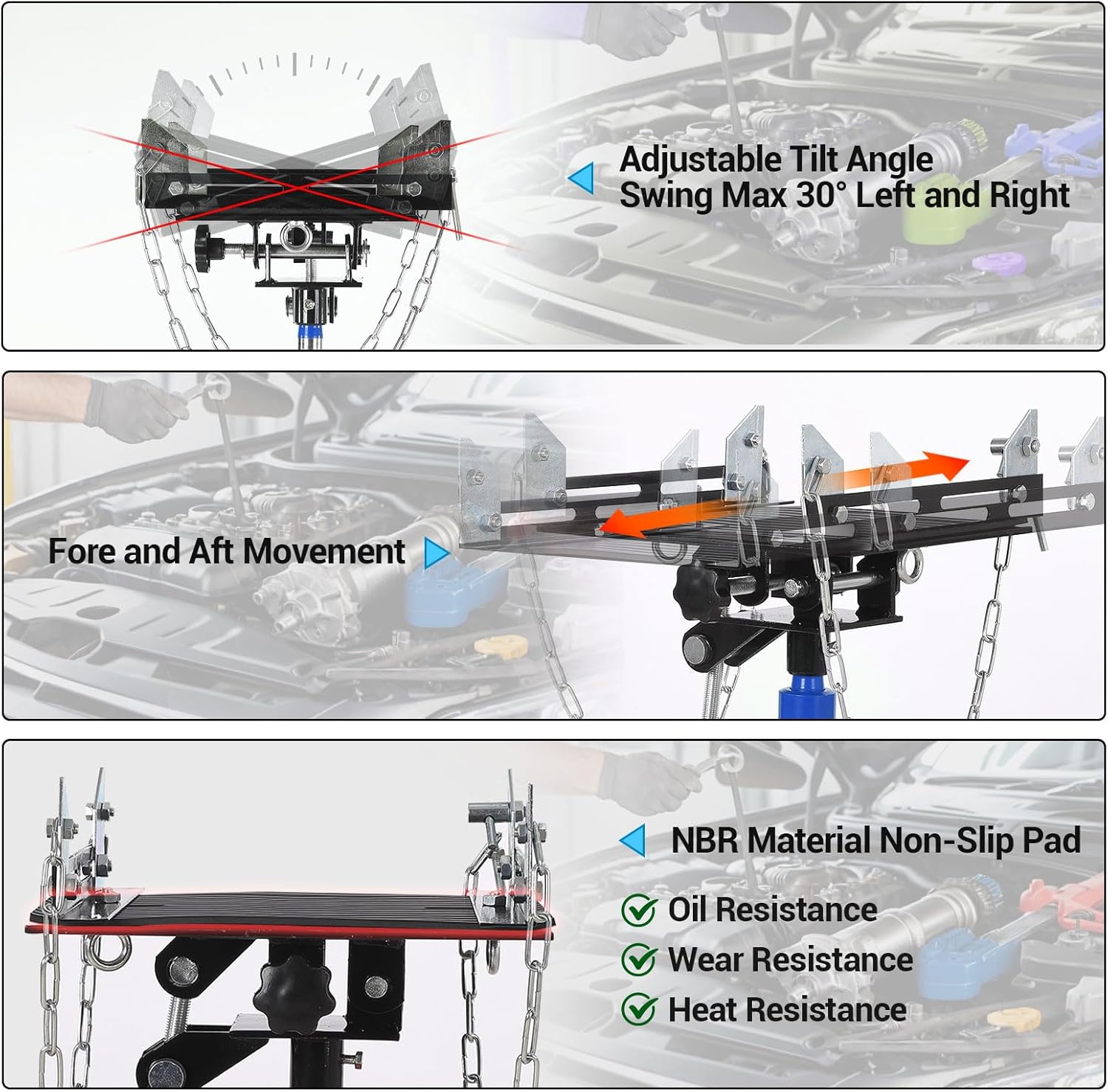 - 【1322 LBS Load Capacity】- This hydraulic transmission jack is engineered from robust carbon steel, ensuring exceptional durability and strength, and maximum load capacity is up to 1322lbs. Its wide base provides enhanced stability, while the two heavy-duty safety anchor chains securely hold the load in place, allowing for safe and efficient transmission service. In addition, it comes with an 8MM thick anti-slip pad to ensure safe load.
