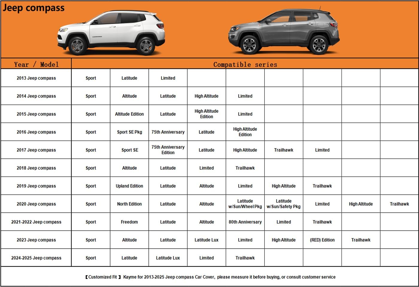 - 【Suitable for】— Custom fit for Jeep compass(2006-2025) Come with a large enough portable bag to store your cover when you do not use.