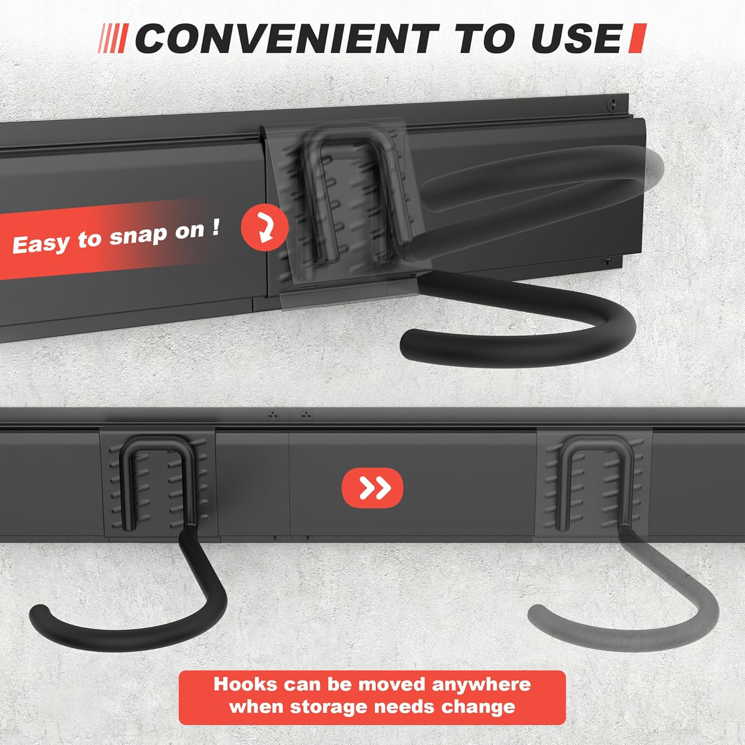 - Adjustable Snap-On Design: The snap-on hook design allows you to easily move and adjust hook placement on the rails. Effortlessly customize the spacing to fit various bike sizes, making it convenient to arrange bikes and helmets to suit your needs