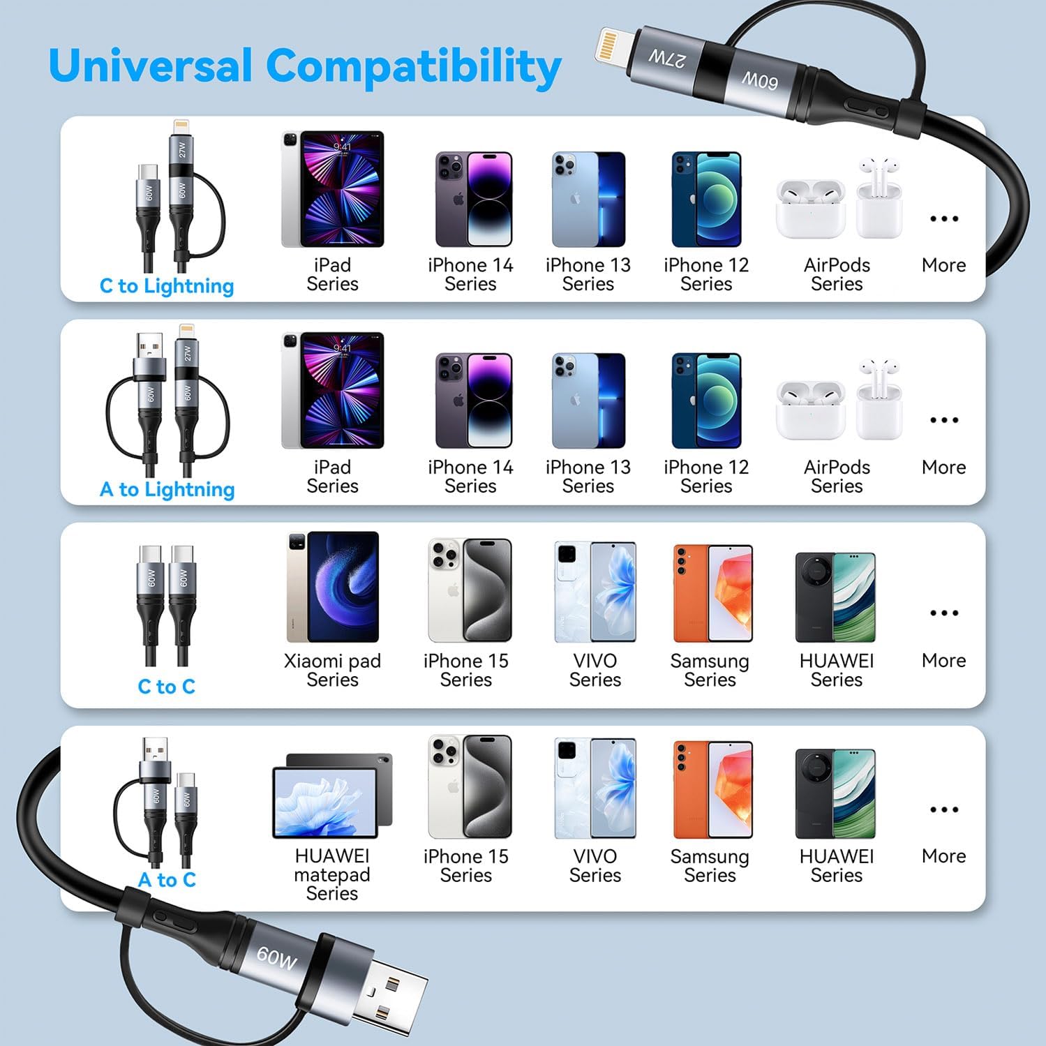- 🔋【Universal Compatibility】: USB A/C to lightning cable supports Fast Charging for iPhone 14/14 Plus/14 Pro/14 Pro Max/13/13 Pro/13 Pro Max/13mini/12/12 Mini/12 Pro/12 Pro Max1/11 Pro/11 Pro Max/ XS Max/ XS/ SE 2020/8/ 8 Plus and iPad. USB A/C to USB C Cable for iPhone 16/15/15 Pro/15 Pro Max/Samsung Galaxy S23/S22/S21 Ultra/S20/S20 fe/S10/S10e/S10+/S8/S8+/S9/S9+ S8 Plus/A02s /A03s /A10e/ A11/ A12 /A13/ A20 /A21 /A32 /A33/ A42/ A50, Google Pixel 7/7 Pro/7a/6a/6/6 Pro/5/4/4a and other USB C devices.