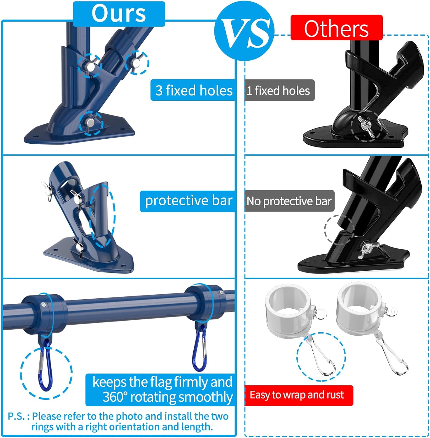 - Unique Bracket: The high strength aluminum alloy flag pole holder for outside house has been upgraded with unique protective bar and 3 fixed holes to make the two-position (90° and 45°) flagpole more stable