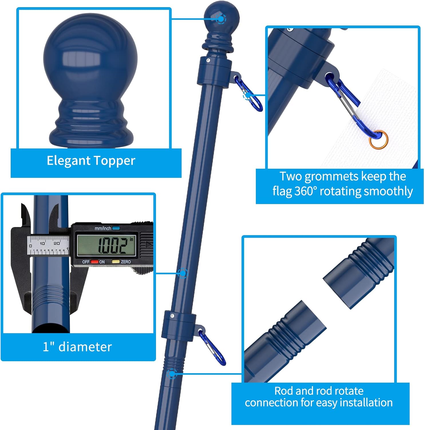 - Exquisite Design: 2*Flag Poles Diameter 1'', 2*Upgraded Brackets, 4*New Tangle Free Rings, 6*Carabiners, 2*Top Balls, 1*Installation Manual