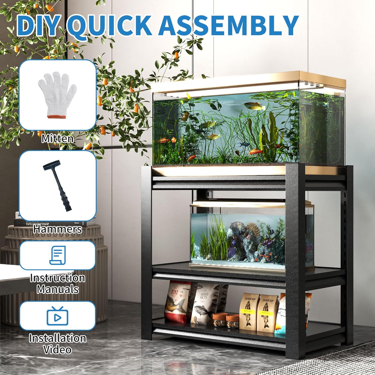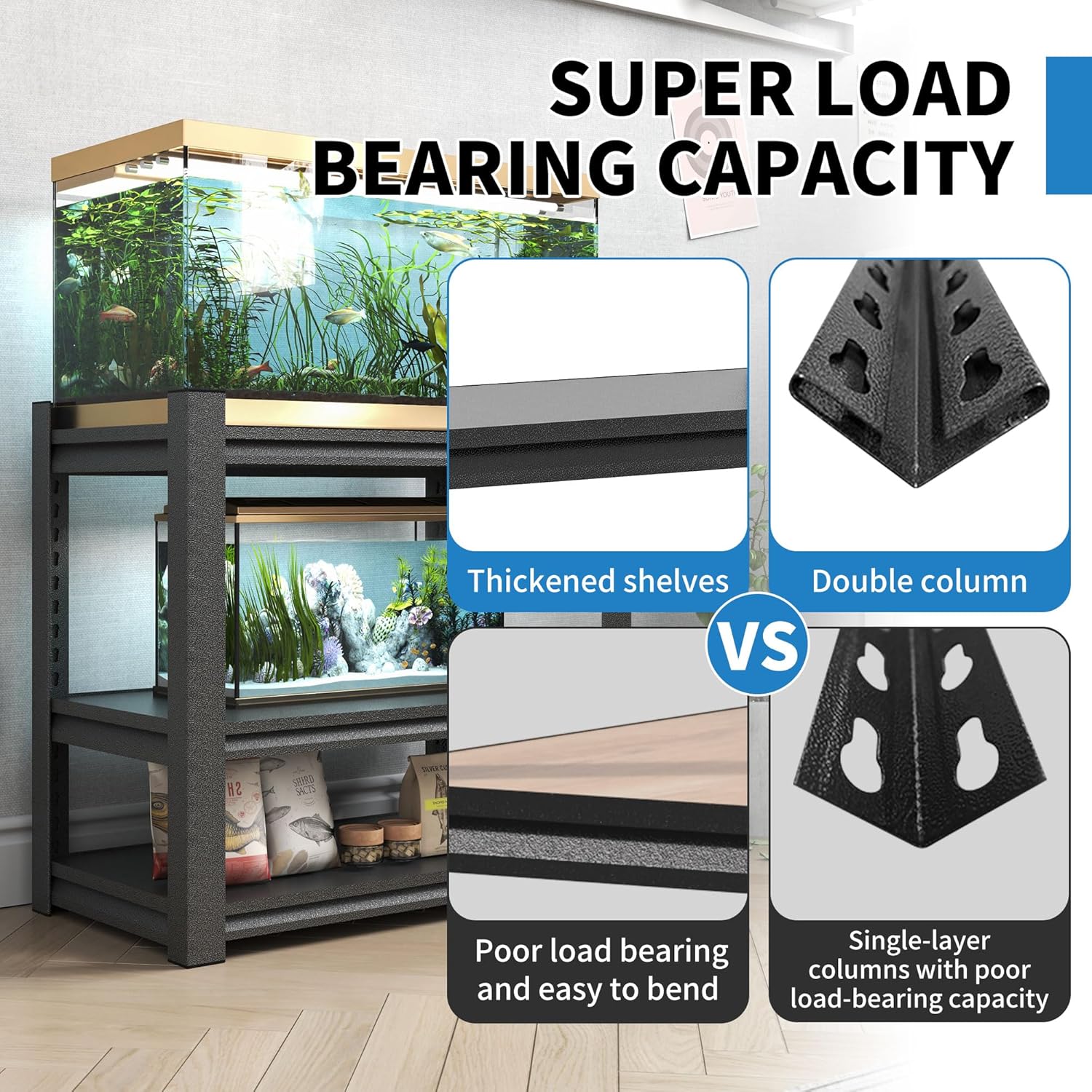 3 Tier Metal Shelving Unit, Aquarium Shelf System, Small Storage Organizer Racks for Basement Garage Laundry Utility Shelving (Black)