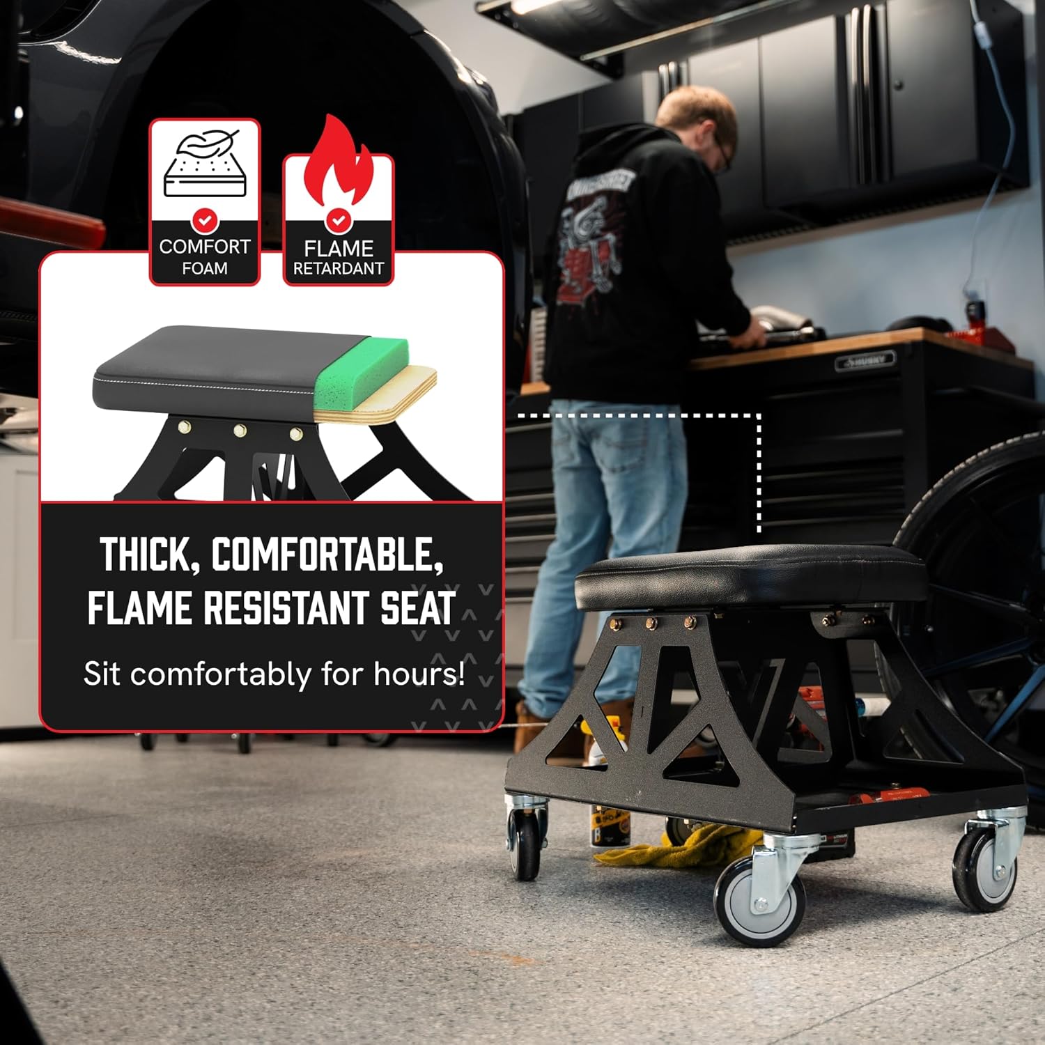 - Convenient, double-sided tool tray – Keep your tools close by, off the floor, and ready with the built-in tool tray—an efficient and convenient addition to any garage or shop chair.