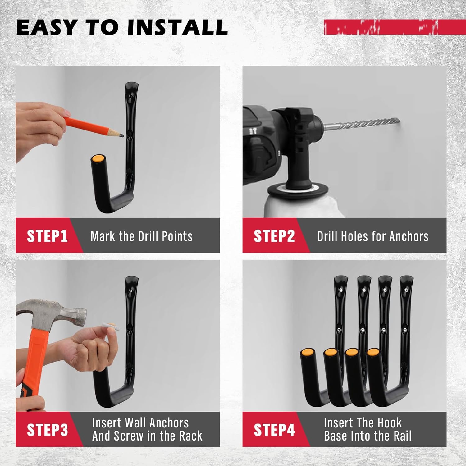 - STURDY CONSTRUCTION – Built from high-quality low-carbon steel, these heavy-duty garage wall hooks feature a rust-resistant powder-coated finish. They support up to 100lbs and include EVA arm protectors to prevent damage to your gear