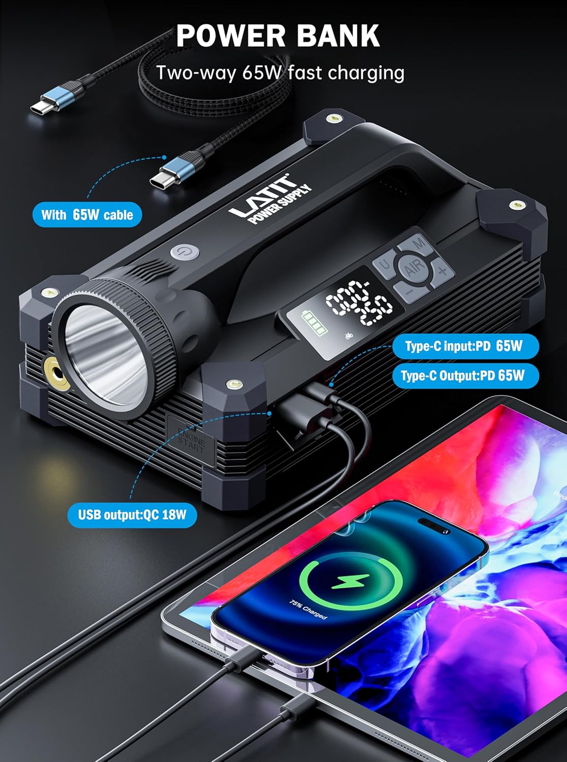 - Powerful Performance - Start low voltage or dead batteries in seconds with LATIT Super peak 6000A jump Starter, is capable of jump-starting 12V vehicles up to 10L gas or 8L diesel engines, This makes it suitable for a wide range of 12 volt vehicles, such as cars trucks, motorcycles, ATVs, snowmobiles, lawnmowers, yachts, etc., No more waiting anxiously for roadside assistance or help.