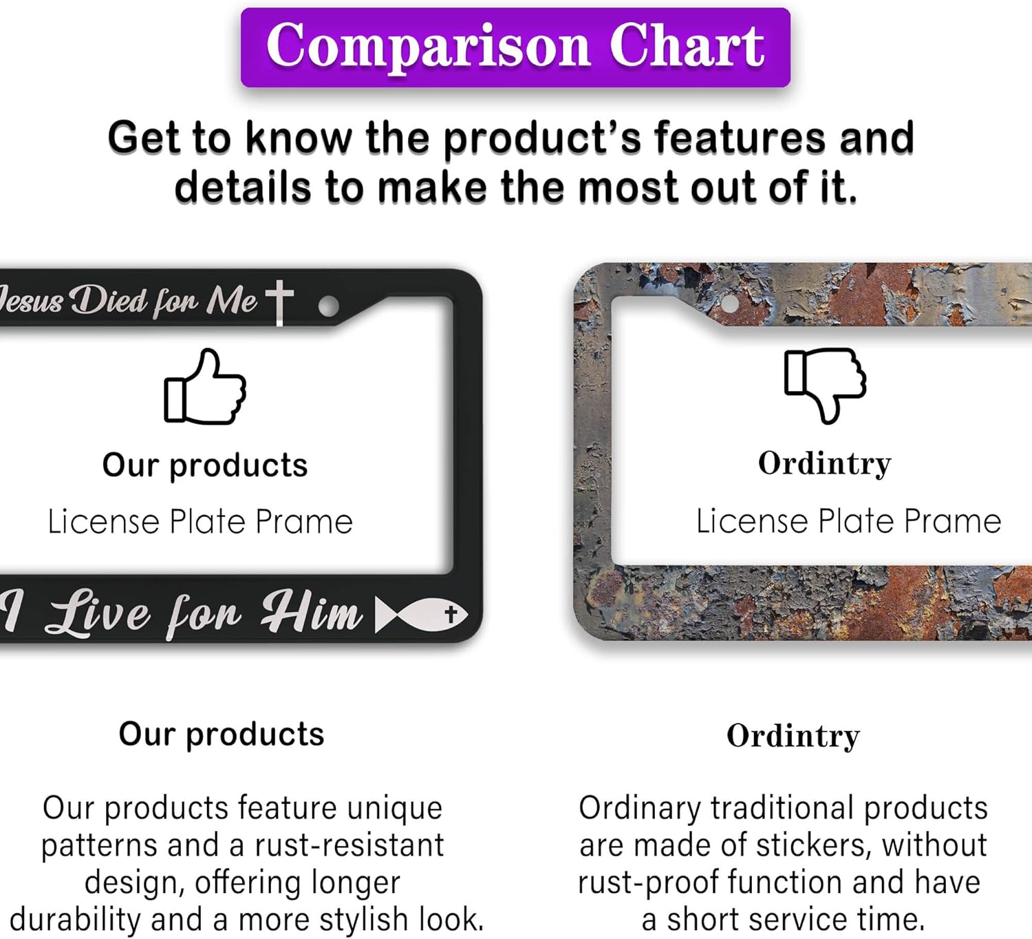 - ALUMINUM FRAME: This License Plate Frame is crafted from high-quality aluminum that is resistant to corrosion, rust, and harsh weather conditions. Its rugged reliability design ensures a long lifespan, making it capable of withstanding car washes and extreme weather, providing you with a reliable and stylish solution for your vehicle.