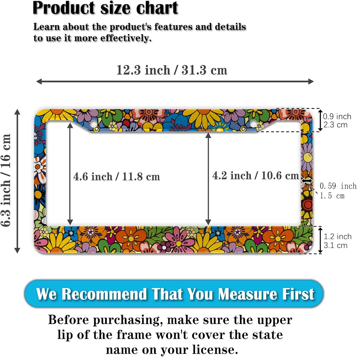 - STANDARD FRAME SIZE: Ensure a perfect fit by checking the dimensions to avoid covering your state name. These frames are specifically designed to fit standard American license plates measuring approximately 12.3" x 6.3" (16 x 31 cm). for most license plates in the U.S.
