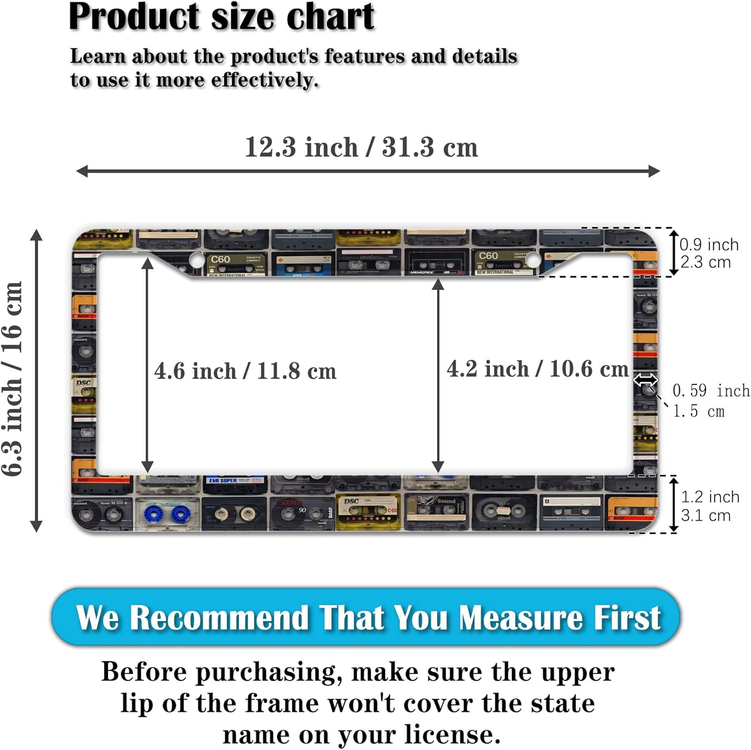 - STANDARD FRAME SIZE: Ensure a perfect fit by checking the dimensions to avoid covering your state name. These frames are specifically designed to fit standard American license plates measuring approximately 12.3" x 6.3" (16 x 31 cm). for most license plates in the U.S.