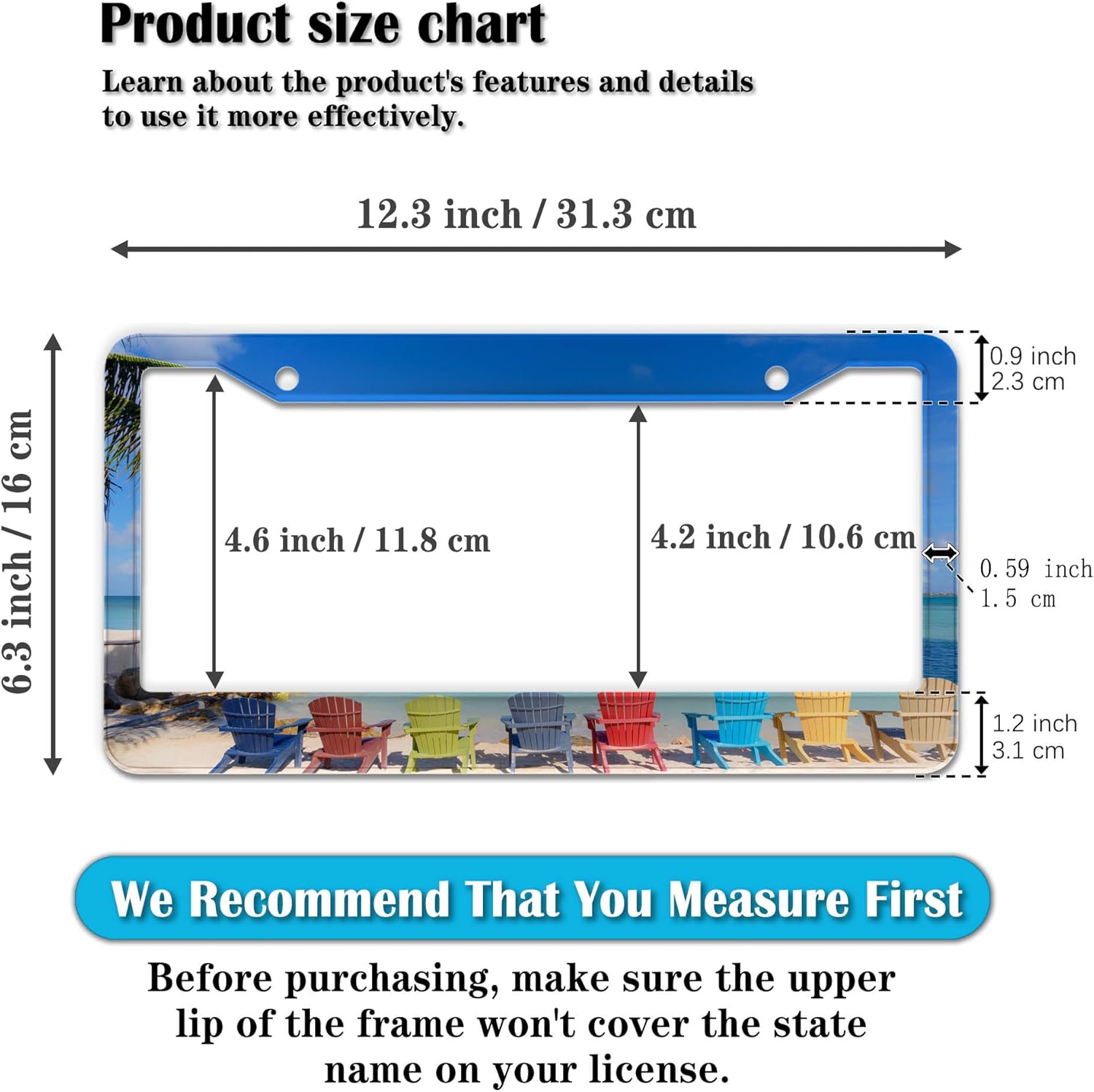 - STANDARD FRAME SIZE: Ensure a perfect fit by checking the dimensions to avoid covering your state name. These frames are specifically designed to fit standard American license plates measuring approximately 12.3" x 6.3" (16 x 31 cm). for most license plates in the U.S.