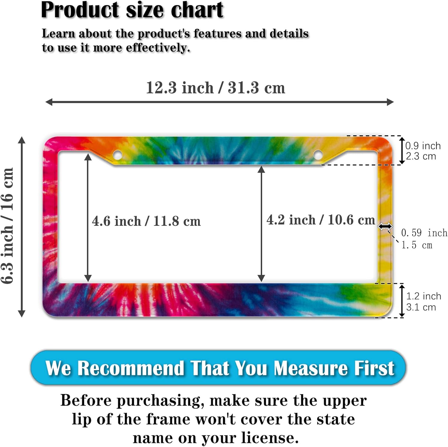 - STANDARD FRAME SIZE: Ensure a perfect fit by checking the dimensions to avoid covering your state name. These frames are specifically designed to fit standard American license plates measuring approximately 12.3" x 6.3" (16 x 31 cm). for most license plates in the U.S.