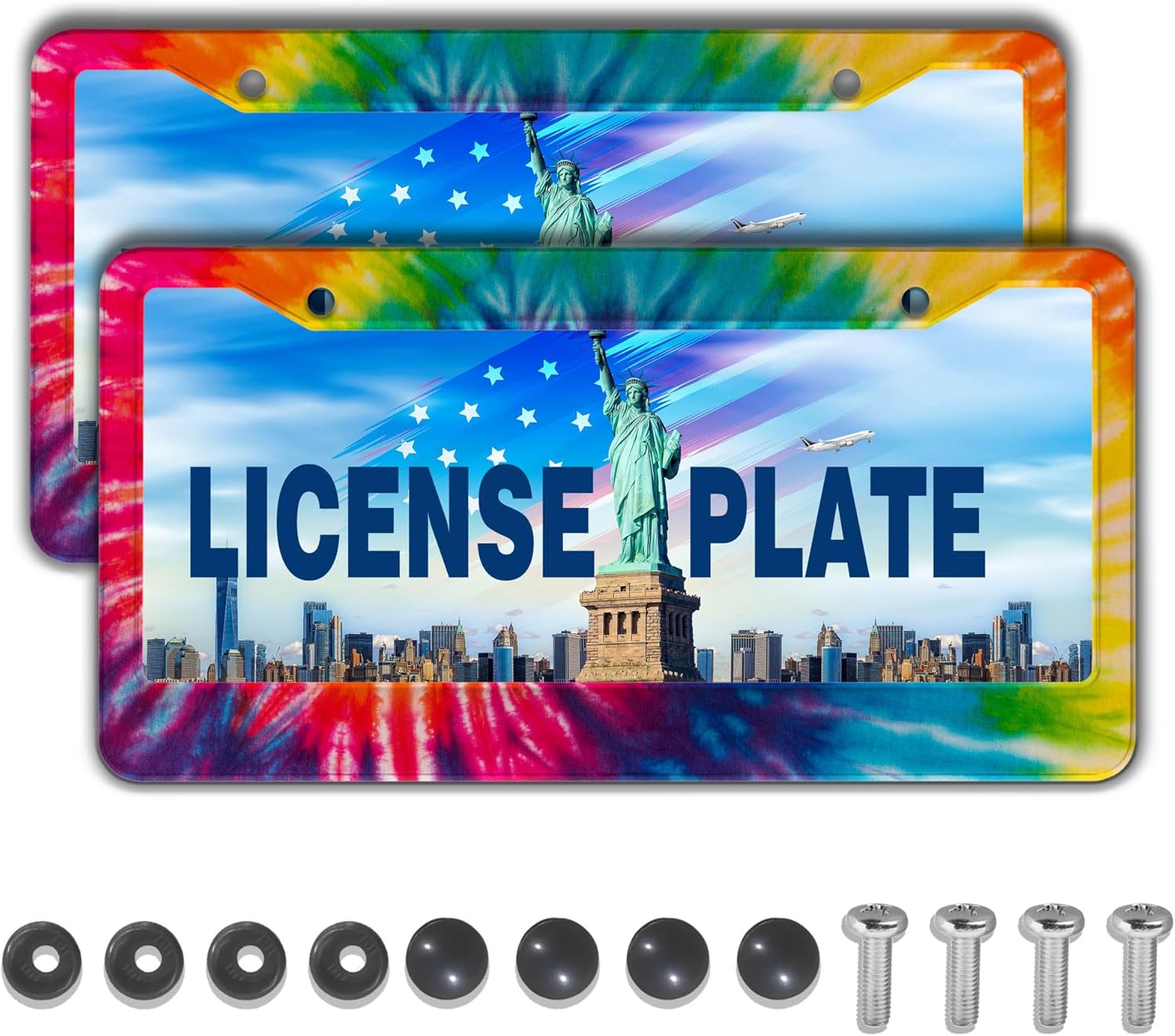 License Plate Frames for Men Rainbow License Plate Frame for Women Novelty Tie Dye Painting Aluminum Metal Car Accessory 2 Pack with Screw Covers Set