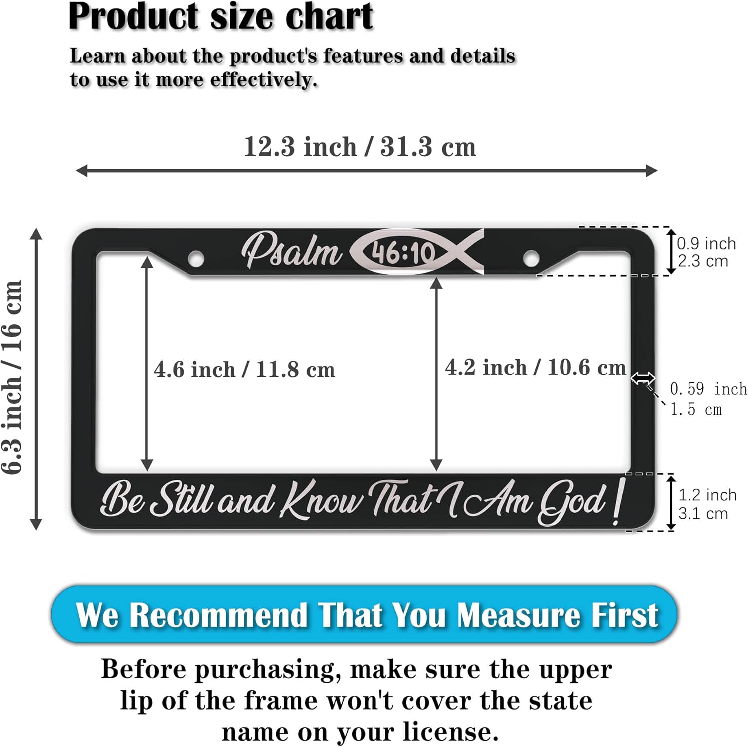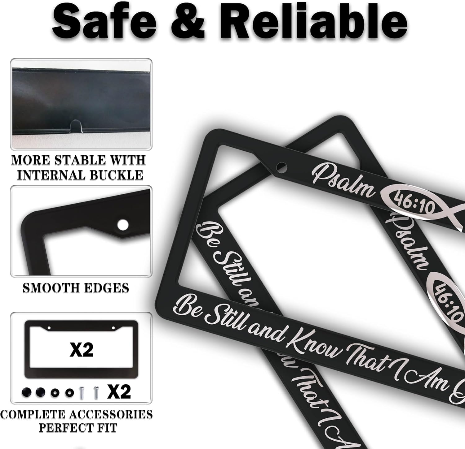 License Plate Frames Black and White License Plate Frame Psalm 46:10 Be Still and Know That I Am God Aluminum Metal Car Accessory 2 Pack with Screw Covers Set
