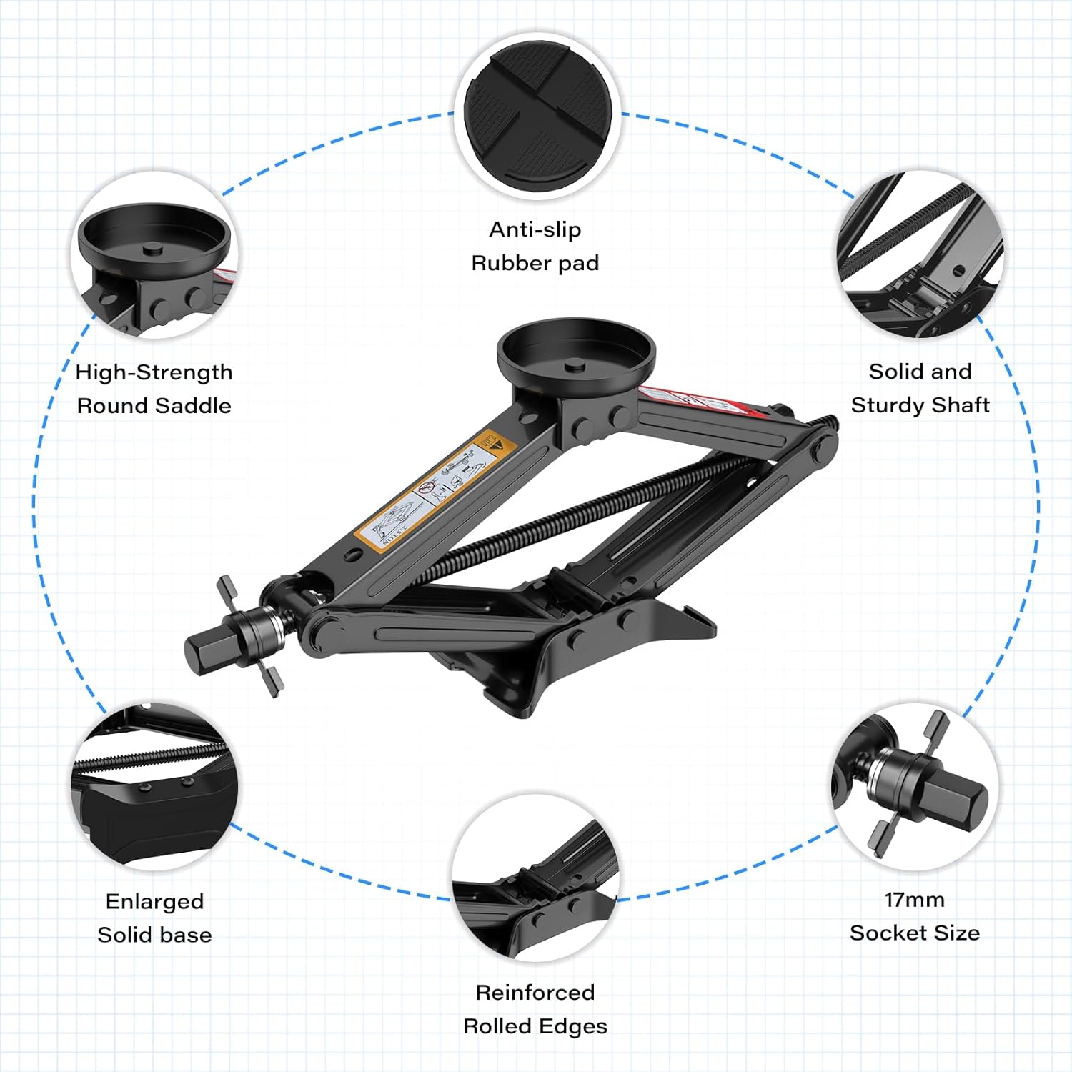 - 【Durable and Universal 】This car jack kit is made of high-strength cold-rolled steel with an enlarged base that ensures its stability during lifting; and it comes with two non-slip Jack rubber pads that match it, which protects the car from steel beam scratches while lifting.