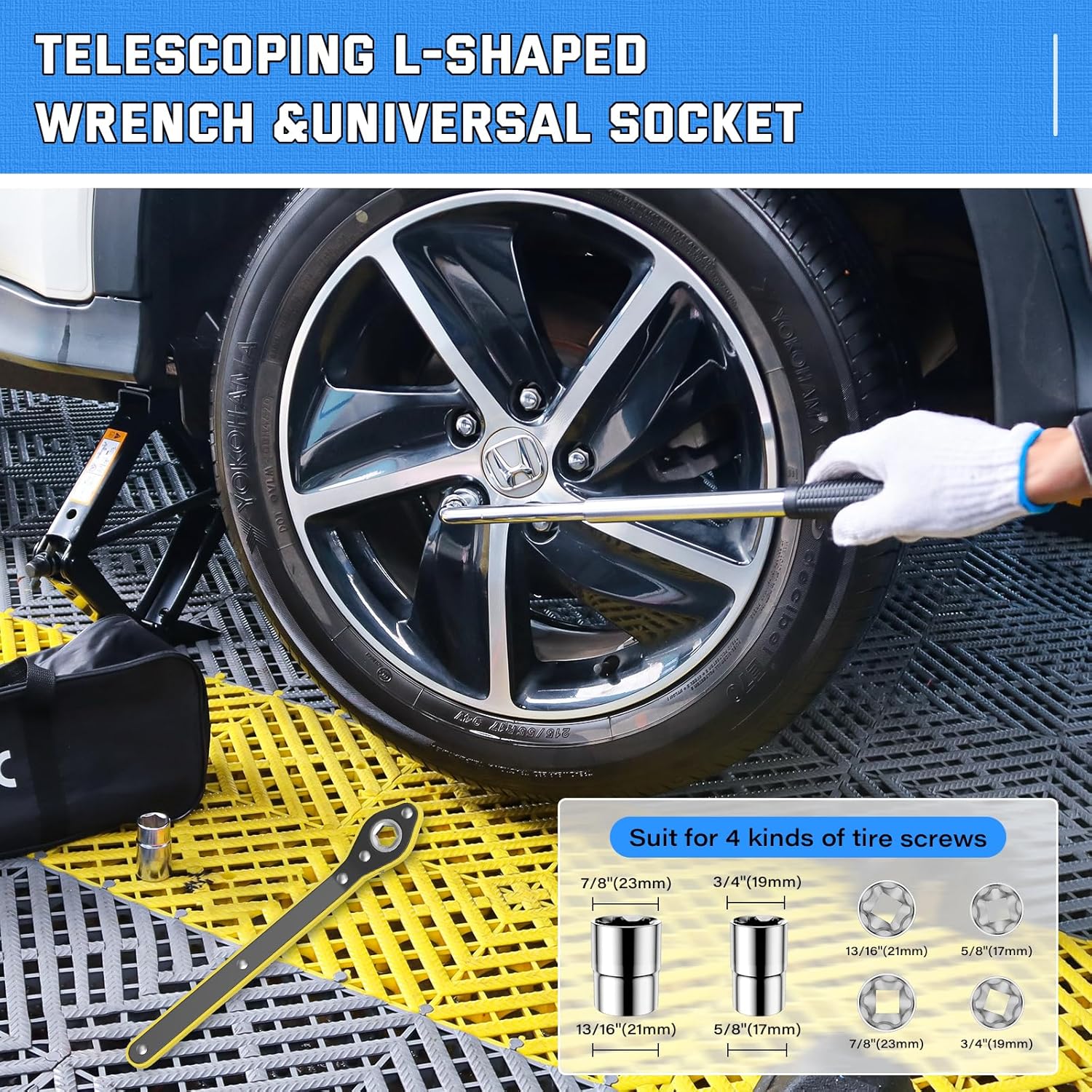 - 【Complete Tire Jack Kit】2.5T Scissor jack x 1; Rubber Pad x 2 ; Ratchet Wrenchx 1; Lug Wrench(17/19mm 21/23mm) x 1; Gloves x 1; Storage Bag x 1.he all-inclusive kit fits perfectly in your trunk or garage, ready to tackle any emergency tire replacement job.