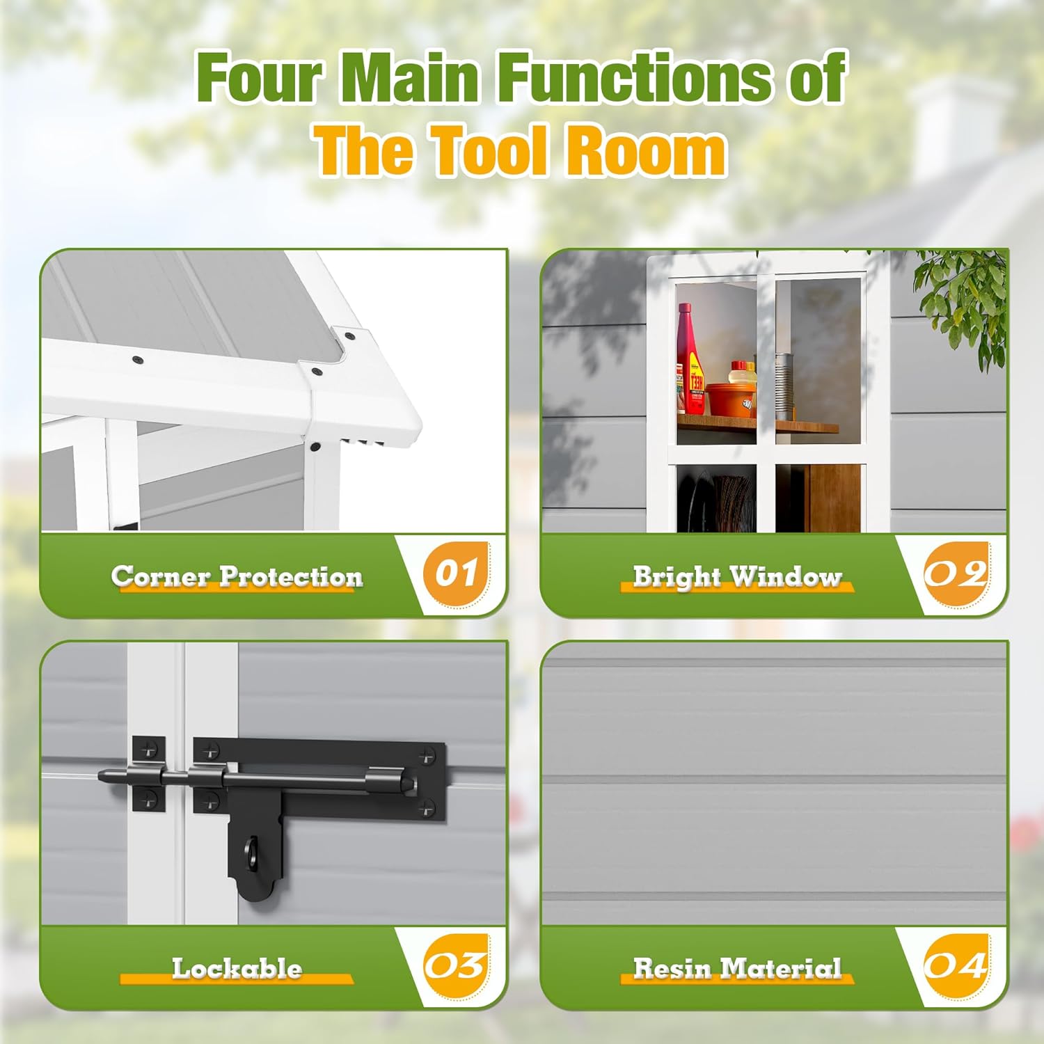 - ECO-FRIENDLY MATERIAL: The shed is made of green polyethylene resin plastic, which can be recycled at the end of life. In addition, this material is weather resistant, waterproof and UV resistant, and will not peel off, strong and durable.