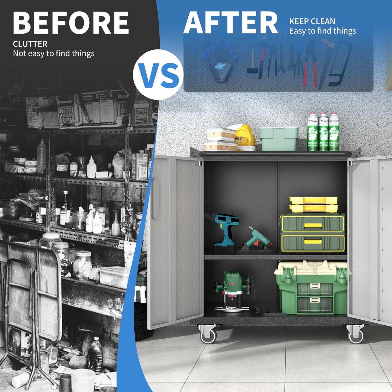 Metal Storage Cabinet with Wheels, Rolling Tool Cabinet with Doors and Shelves, Lockable Garage Storage Cabinet, Assembly Required (Black & Grey)