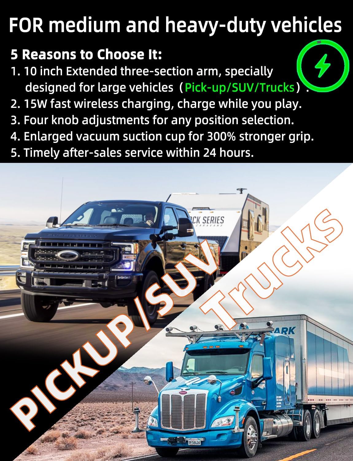 - 【Designed for Pickups and Trucks】The WKESI phone holder for truck is suitable for pickups, large SUVs, buses, semi-trucks, and box trucks. It is highly flexible and can be used on different surfaces of heavy-duty vehicles. Whether you need to mount it on the windshield or dashboard, it adapts perfectly to all positions and functions.