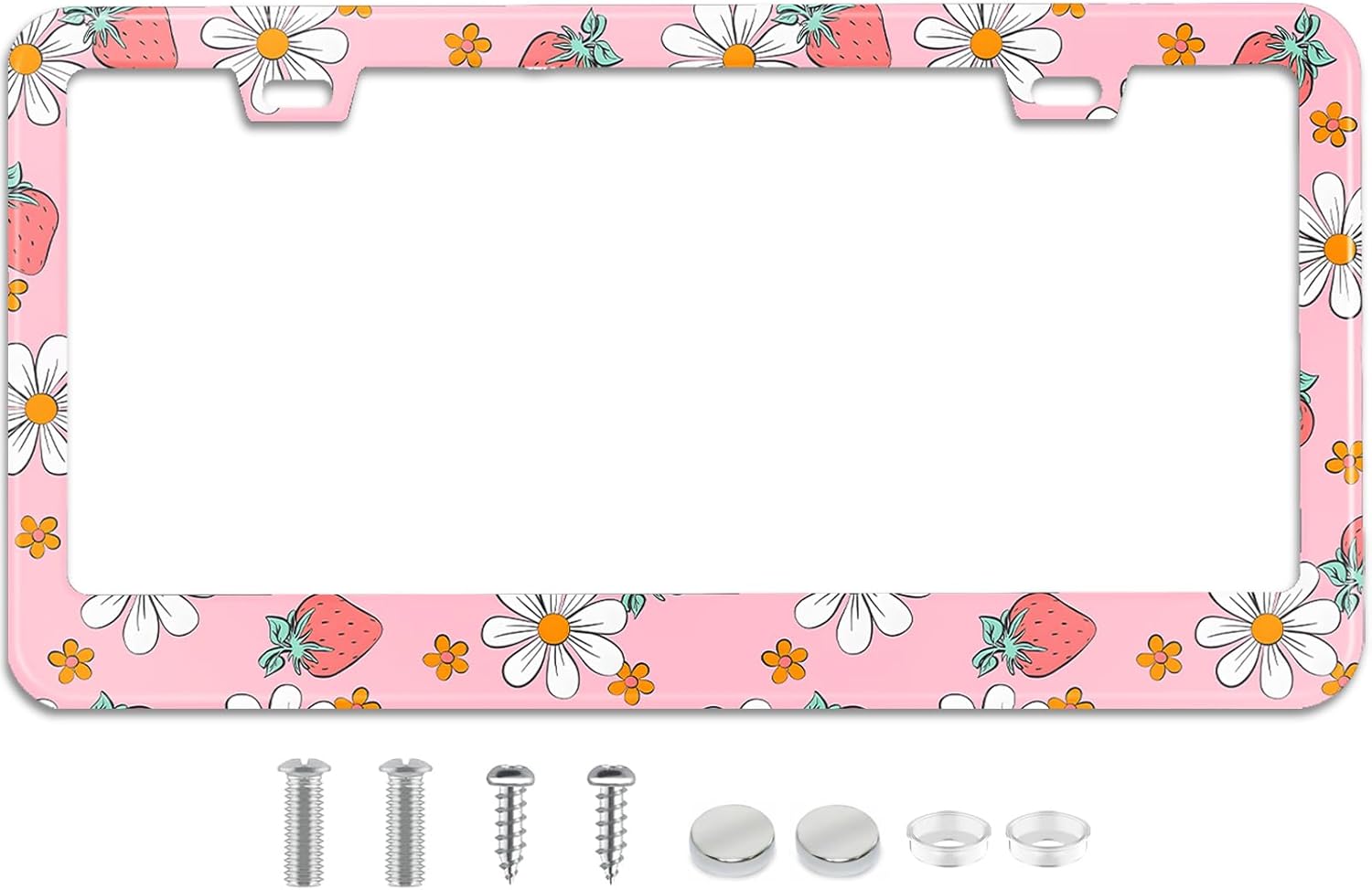 Pink Strawberry Floral License Plate Frame Stainless Steel License Plate Frames Holder Covers Rust-Proof Auto Parts Decoration with Screws License Plate Holder for Car Accessories 12x6 Inch